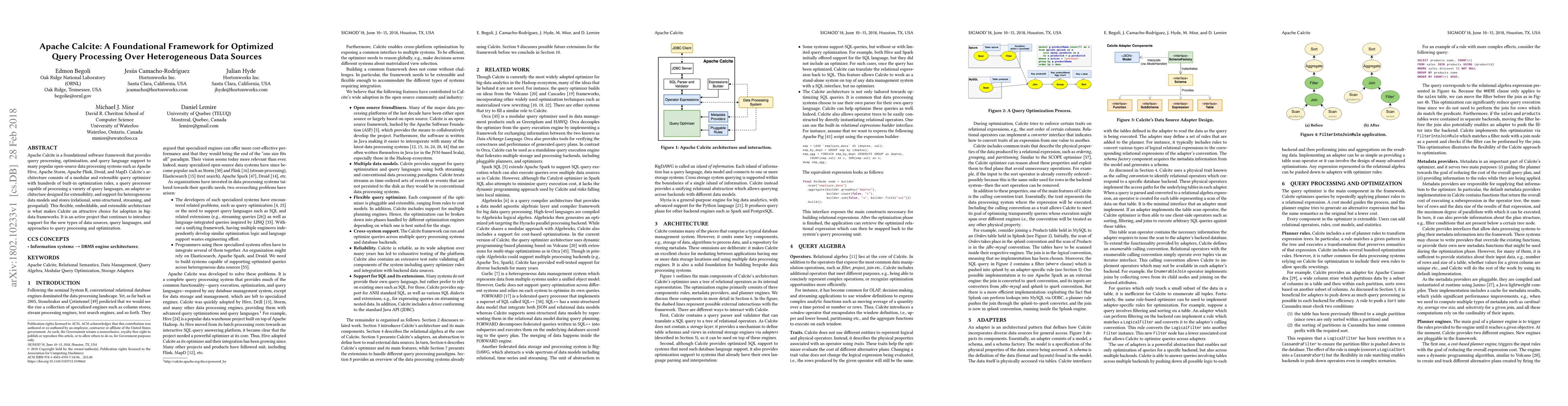 Apache Calcite is a foundational software framework that provides query processing, optimization, and query language support to many popular open-source data processing systems such as Apache Hive, Apache Storm, Apache Flink, Druid, and MapD. Calcite's architecture consists of a modular and extensible query optimizer with hundreds of built-in optimization rules, a query processor capable of processing a variety of query languages, an adapter architecture designed for extensibility, and support for heterogeneous data models and stores (relational, semi-structured, streaming, and geospatial). This flexible, embeddable, and extensible architecture is what makes Calcite an attractive choice for adoption in big-data frameworks. It is an active project that continues to introduce support for the new types of data sources, query languages, and approaches to query processing and optimization.