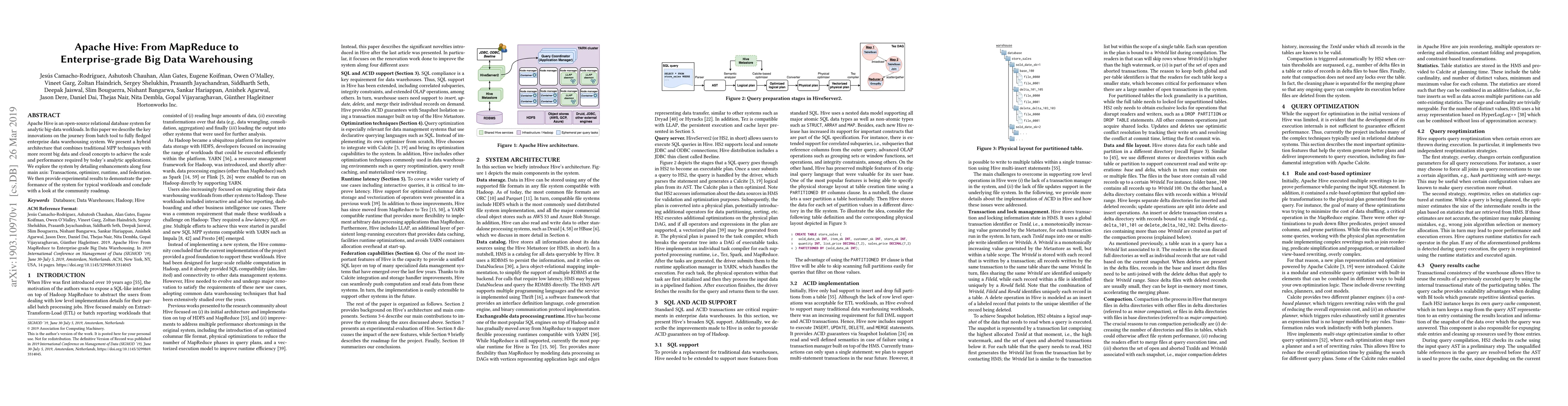 This paper presents Apache Hive as a hybrid architecture for enterprise-grade big data warehousing, combining traditional MPP techniques with recent cloud concepts to achieve scale and performance. The system has been enhanced along four main axes and demonstrated through experimental results.