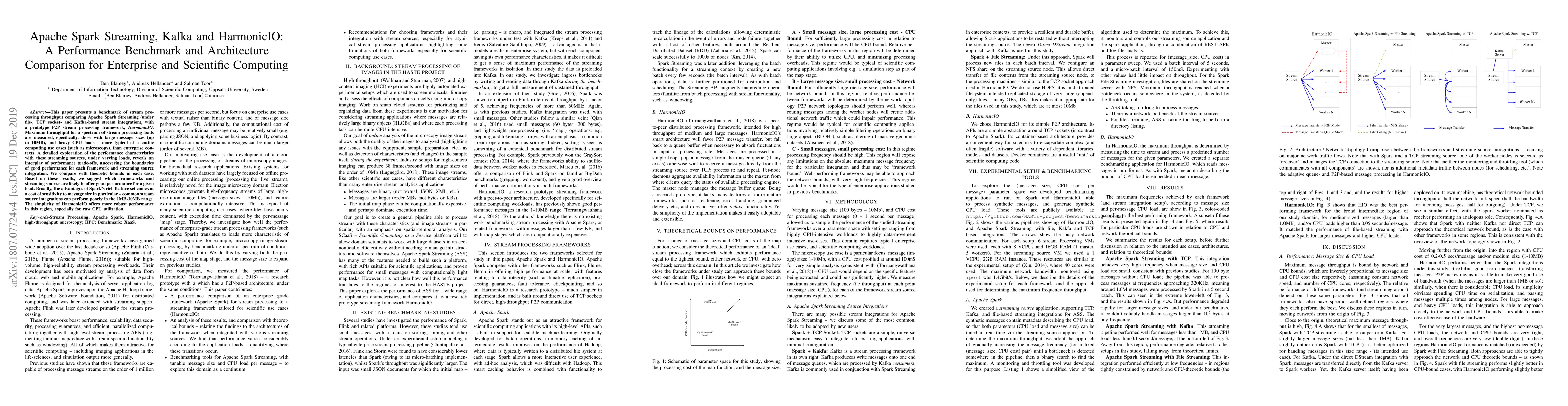 This paper benchmarks Apache Spark Streaming against HarmonicIO for stream processing throughput, focusing on large message sizes and high CPU loads typical in scientific computing. It finds that Spark's feature richness comes with sensitivity to message size, while HarmonicIO offers more consistent performance, especially for CPU utilization.