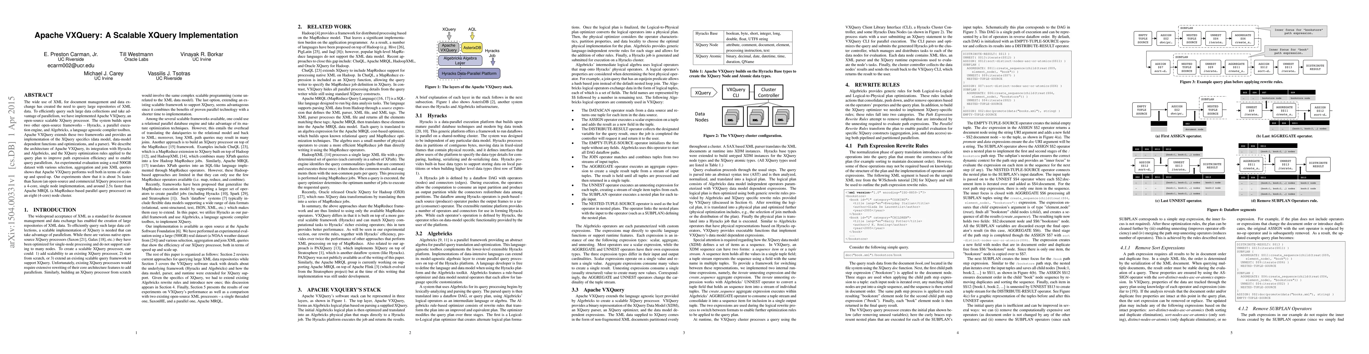 Apache VXQuery is a scalable XQuery processor built on Hyracks and Algebricks to efficiently query large XML data repositories, demonstrating significant performance improvements over existing XQuery processors in both single-node and multi-node setups. Experimental results show it is about 3x faster than Saxon on a 4-core node and 2.5x faster than Apache MRQL in a cluster.