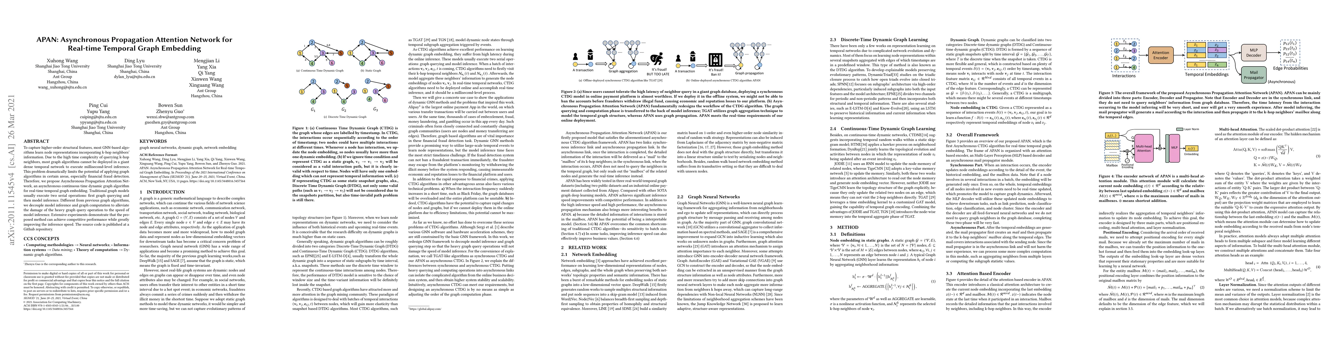 The Asynchronous Propagation Attention Network (APAN) proposes an asynchronous dynamic graph algorithm to enable real-time temporal graph embedding, decoupling graph computation from model inference to achieve significant speed improvements while maintaining competitive performance. Experiments show an 8.7 times increase in inference speed.