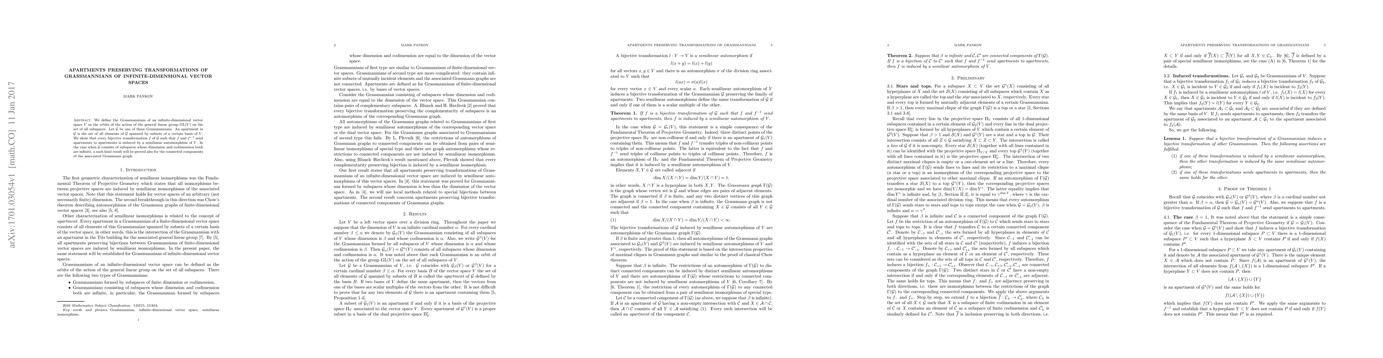This paper defines Grassmannians of infinite-dimensional vector spaces as orbits under the action of the general linear group. It shows that bijective transformations of these Grassmannians that map apartments to apartments are induced by semilinear automorphisms of the vector space, with a similar result for connected components in the case of infinite-dimensional subspaces.