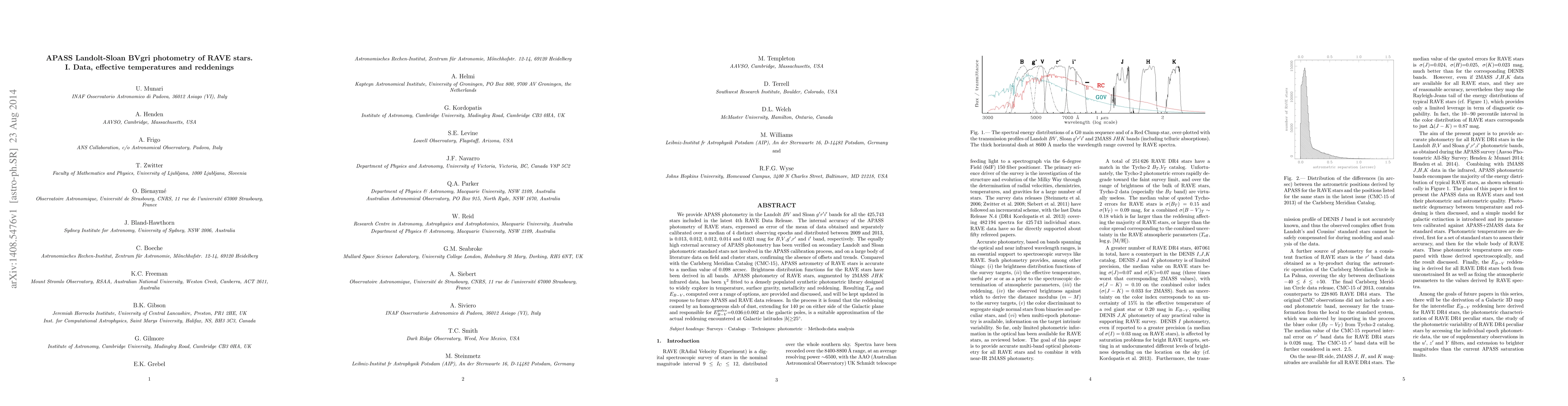 This paper provides APASS Landolt-Sloan BVgri photometry for 425,743 RAVE stars, achieving internal accuracy of 0.013-0.021 mag. The study also derives effective temperatures and reddenings, finding a suitable dust model for reddening at high Galactic latitudes.