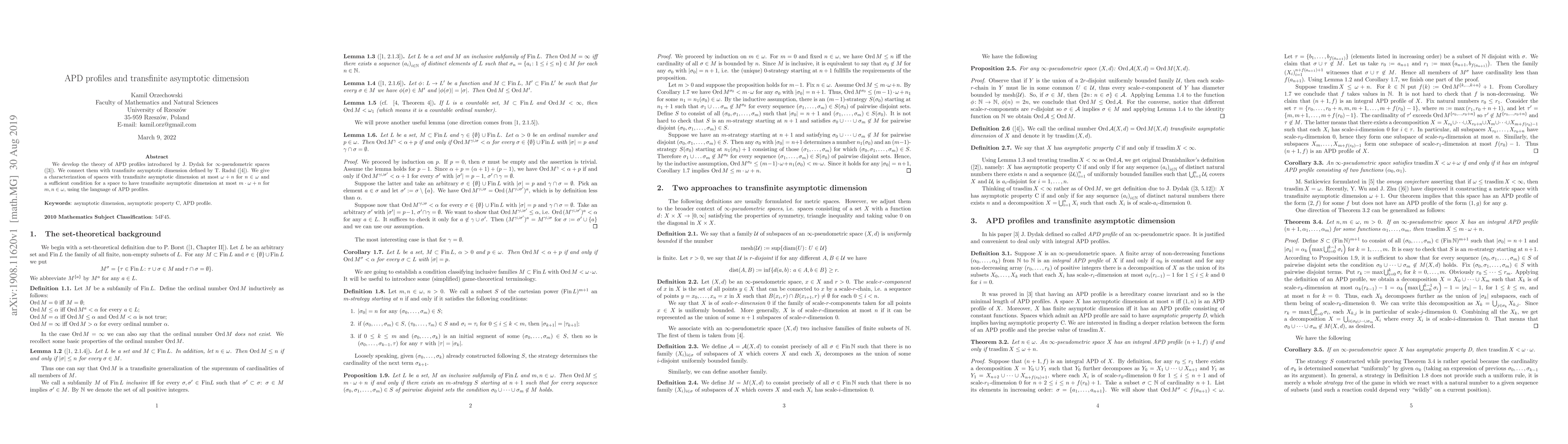 This paper develops the theory of APD profiles for $\infty$-pseudometric spaces and connects them with transfinite asymptotic dimension. It provides a characterization of spaces with transfinite asymptotic dimension at most $\omega+n$ and a sufficient condition for dimension at most $m\cdot \omega+n$.