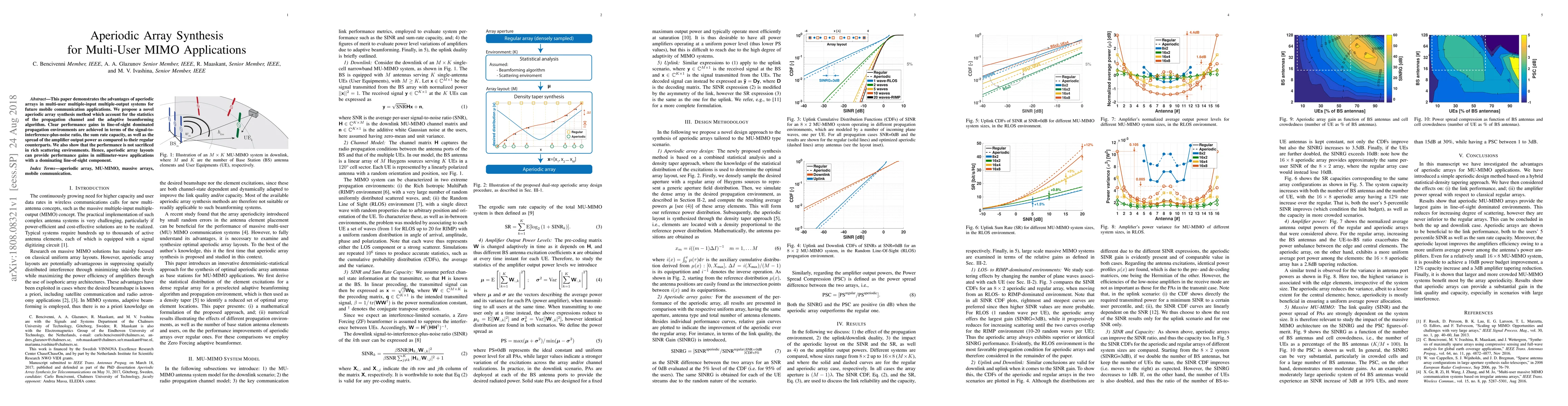 This paper proposes a novel aperiodic array synthesis method for multi-user MIMO systems, demonstrating significant performance gains in line-of-sight environments while maintaining efficiency in rich scattering environments. The method accounts for channel statistics and adaptive beamforming, showing improvements in signal-to-interference-plus-noise ratio, sum rate capacity, and amplifier output power spread.