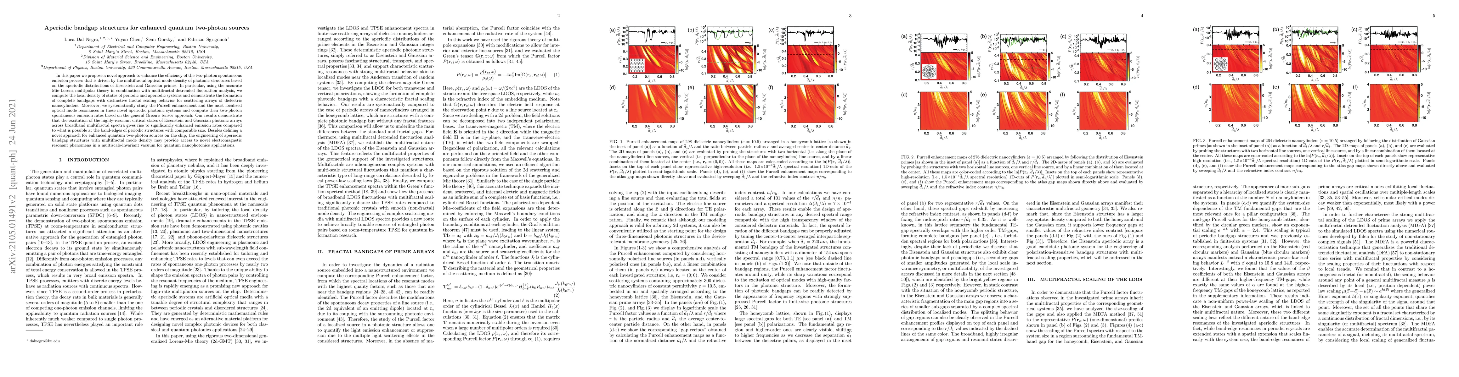 This research proposes a method to boost the efficiency of quantum two-photon sources using aperiodic photonic structures based on Eisenstein and Gaussian primes. The study reveals enhanced two-photon emission rates through the formation of complete bandgaps and distinctive fractal scaling behaviors in dielectric nanocylinder arrays, potentially leading to new quantum nanophotonics applications.