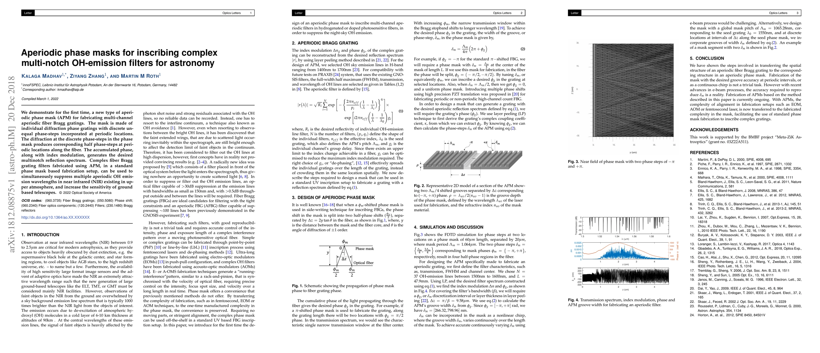 We demonstrate for the first time, a new type of aperiodic phase mask (APM) for fabricating multi-channel aperiodic fiber Bragg gratings. The mask is made of individual diffraction phase gratings with discrete unequal phase-steps incorporated at periodic locations. The diffraction at the discrete phase-steps in the phase mask produces corresponding half phase-steps at periodic locations along the fiber. The accumulated phase, along with index modulation, generates the desired multinotch reflection spectrum. Complex fiber Bragg grating filters fabricated using APM, in a standard phase mask based fabrication setup, can be used to simultaneously suppress multiple aperiodic OH emission wavelengths in near infrared (NIR) existing in upper atmosphere, and increase the sensitivity of ground based telescopes.