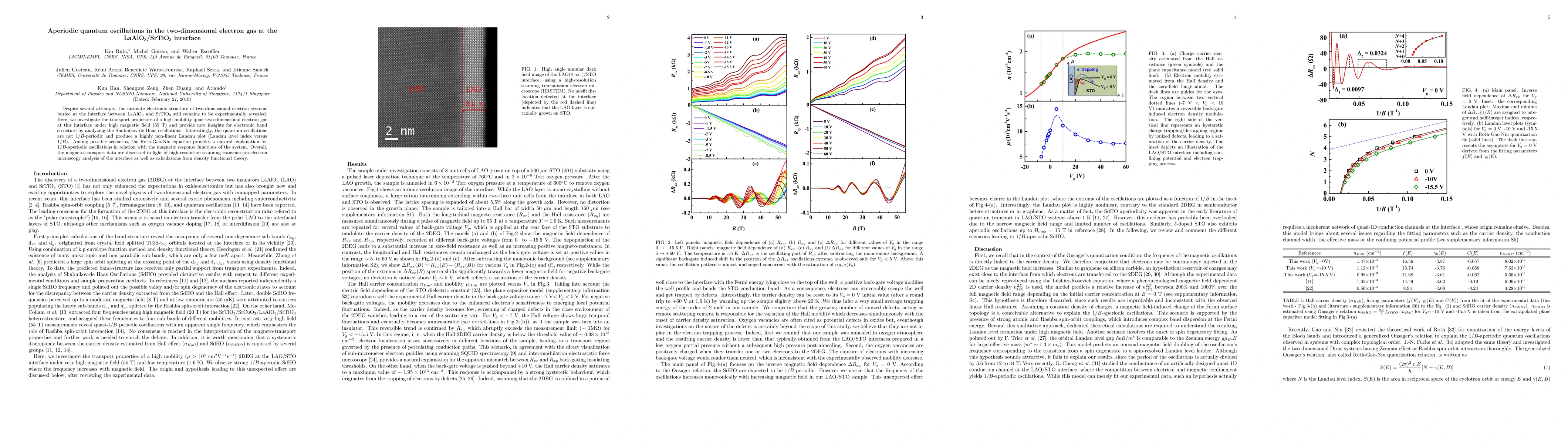 This research investigates the transport properties of a high-mobility electron gas at the LaAlO3/SrTiO3 interface under high magnetic fields, revealing aperiodic quantum oscillations in Shubnikov-de Haas measurements that challenge traditional 1/B-periodic behavior. The findings suggest the Roth-Gao-Niu equation as a plausible explanation for these oscillations.