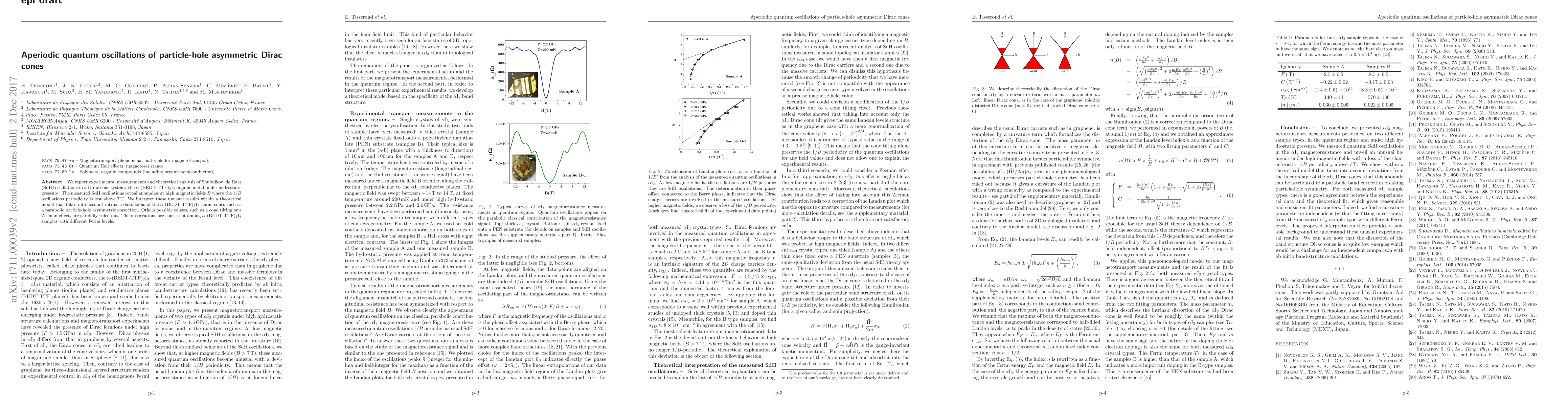 We report experimental measurements and theoretical analysis of Shubnikov-de Haas (SdH) oscillations in a Dirac cone system: the a-(BEDT-TTF)2I3 organic metal under hydrostatic pressure. The measured SdH oscillations reveal anomalies at high magnetic fields B where the 1/B oscillations periodicity is lost above 7 T. We interpret these unusual results within a theoretical model that takes into account intrinsic distortions of the a-(BEDT-TTF)2I3 Dirac cones such as a parabolic particle-hole asymmetric correction. Others possible causes, such as a cone tilting or a Zeeman effect, are carefully ruled out. The observations are consistent among a-(BEDT-TTF)2I3 samples with different Fermi levels.