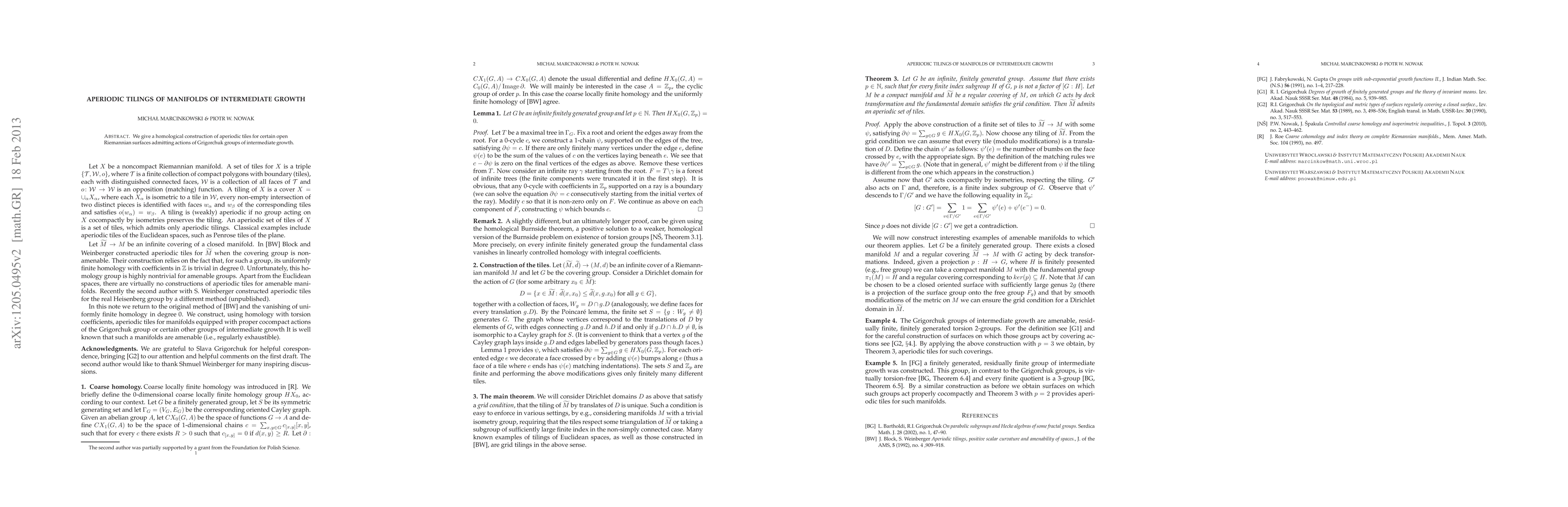 We give a homological construction of aperiodic tiles for certain open Riemannian surfaces admitting actions of Grigorchuk groups of intermediate growth.
