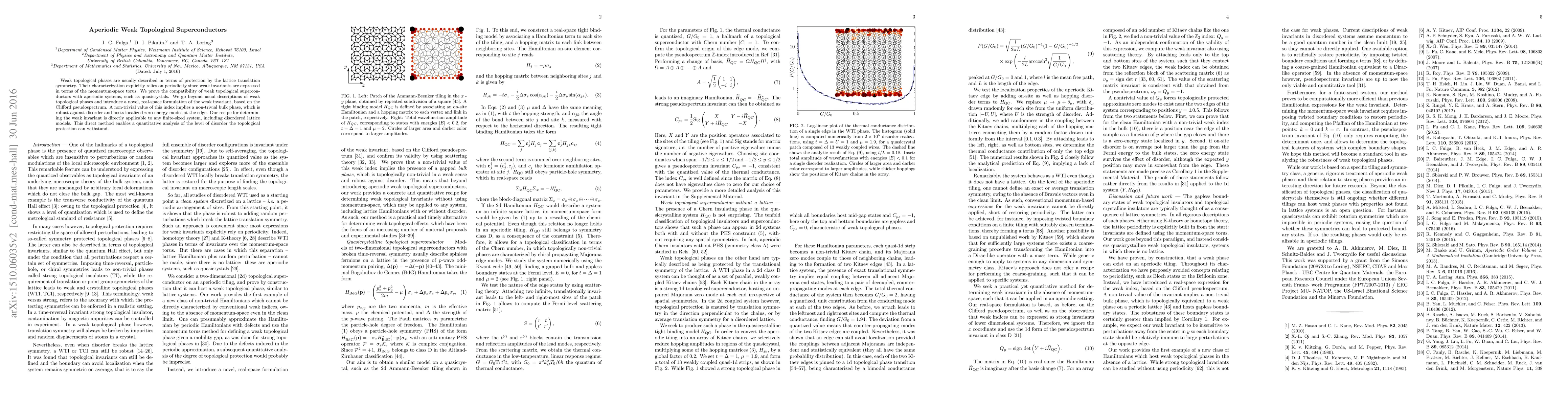 Weak topological phases are usually described in terms of protection by the lattice translation symmetry. Their characterization explicitly relies on periodicity since weak invariants are expressed in terms of the momentum-space torus. We prove the compatibility of weak topological superconductors with aperiodic systems, such as quasicrystals. We go beyond usual descriptions of weak topological phases and introduce a novel, real-space formulation of the weak invariant, based on the Clifford pseudospectrum. A non-trivial value of this index implies a non-trivial bulk phase, which is robust against disorder and hosts localized zero-energy modes at the edge. Our recipe for determining the weak invariant is directly applicable to any finite-sized system, including disordered lattice models. This direct method enables a quantitative analysis of the level of disorder the topological protection can withstand.