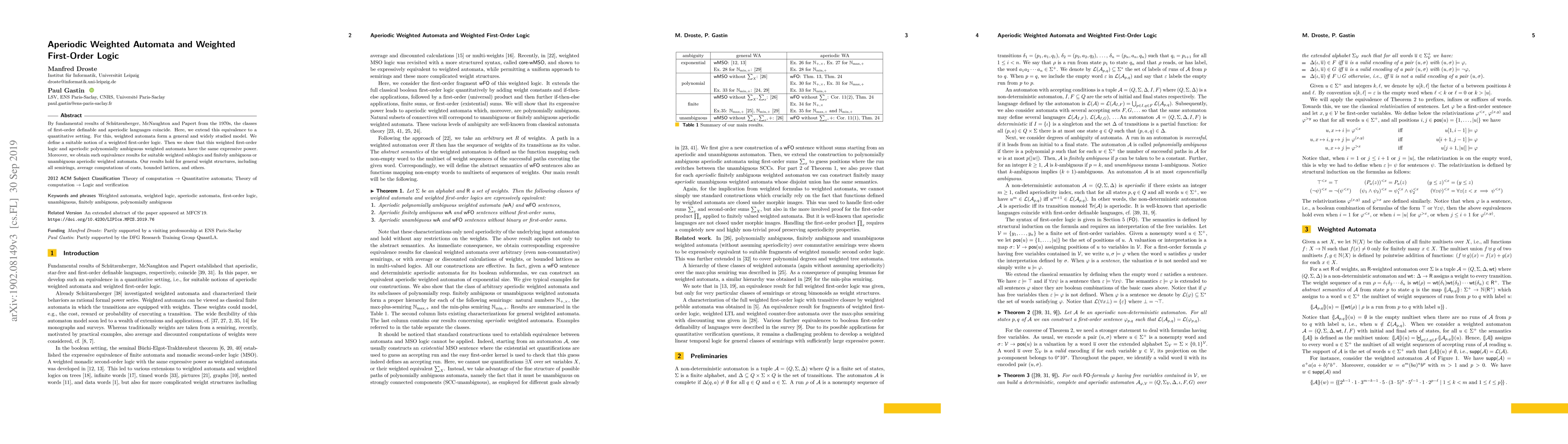 This paper extends the equivalence between first-order definable and aperiodic languages to a quantitative setting using weighted automata. It introduces a weighted first-order logic and proves that this logic has the same expressive power as aperiodic polynomially ambiguous weighted automata across various weight structures.