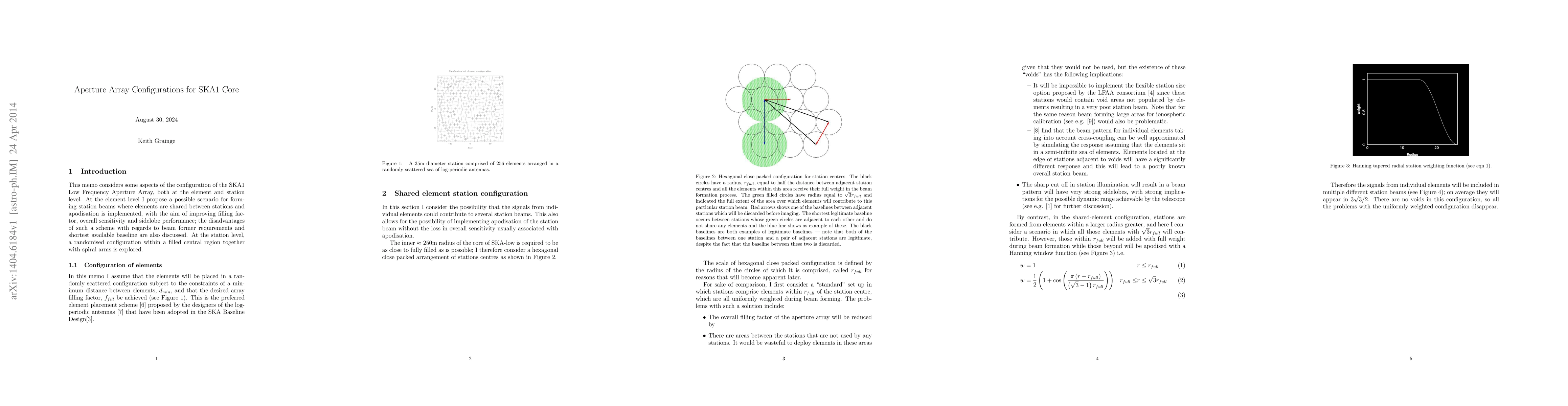 This memo considers some aspects of the configuration of the SKA1 Low Frequency Aperture Array, both at the element and station level. At the element level I propose a possible scenario for forming station beams where elements are shared between stations and apodisation is implemented, with the aim of improving filling factor, overall sensitivity and sidelobe performance; the disadvantages of such a scheme with regards to beam former requirements and shortest available baseline are also discussed. At the station level, a randomised configuration within a filled central region together with spiral arms is explored.