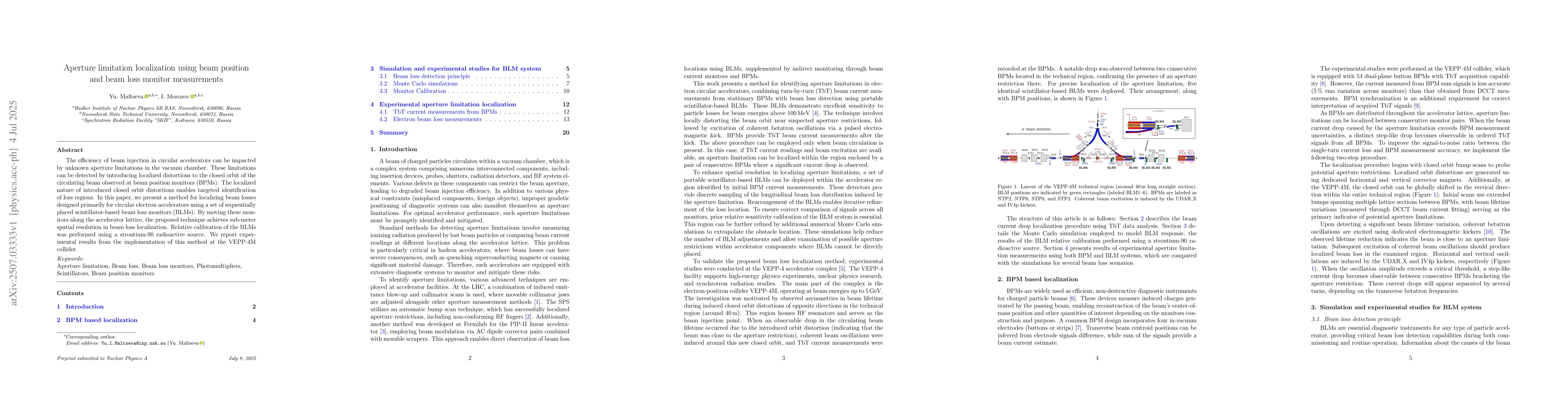 The efficiency of beam injection in circular accelerators can be impacted by unknown aperture limitations in the vacuum chamber. These limitations can be detected by introducing localized distortions to the closed orbit of the circulating beam observed at beam position monitors (BPMs). The localized nature of introduced closed orbit distortions enables targeted identification of loss regions. In this paper, we present a method for localizing beam losses designed primarily for circular electron accelerators using a set of sequentially placed scintillator-based beam loss monitors (BLMs). By moving these monitors along the accelerator lattice, the proposed technique achieves sub-meter spatial resolution in beam loss localization. Relative calibration of the BLMs was performed using a strontium-90 radioactive source. We report experimental results from the implementation of this method at the VEPP-4M collider.