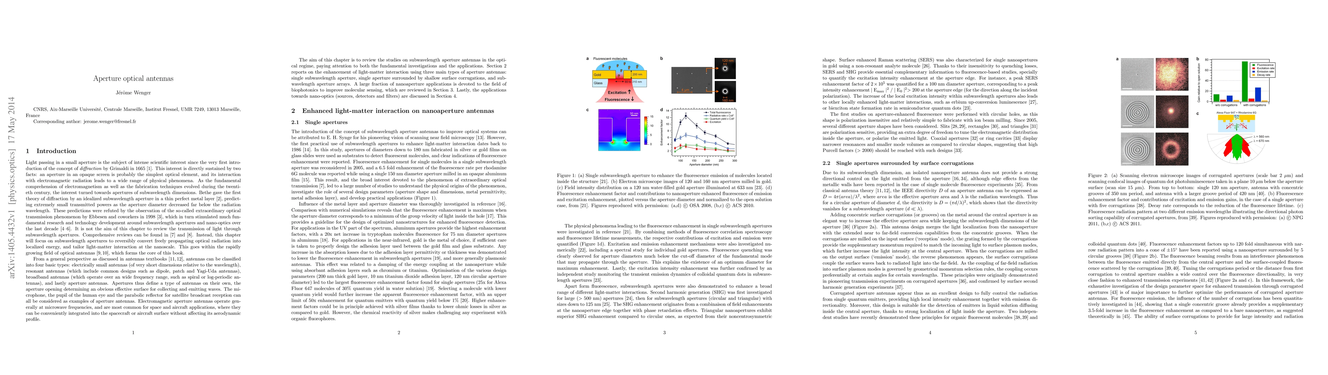 This paper reviews studies on subwavelength aperture antennas in the optical regime, focusing on light-matter interaction enhancements and applications in biophotonics and nano-optics. It covers three main types of aperture antennas and their use in molecular sensing and nano-optics components.