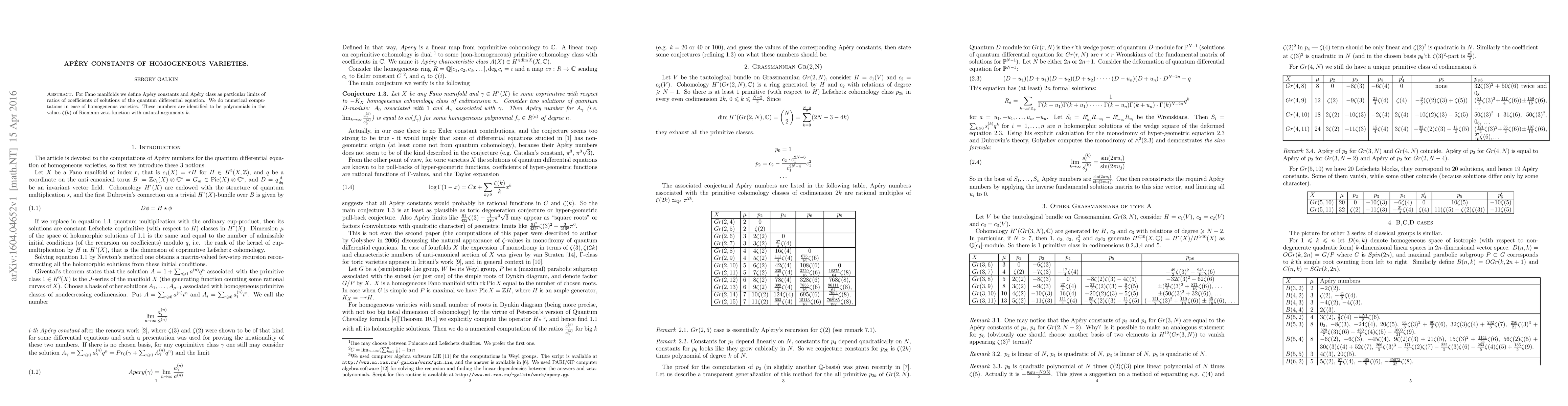 Summary: The paper defines Apéry constants for Fano manifolds as limits of quantum differential equation coefficient ratios, performing numerical computations on homogeneous varieties, and finds these constants correspond to polynomials in Riemann zeta values at natural arguments.