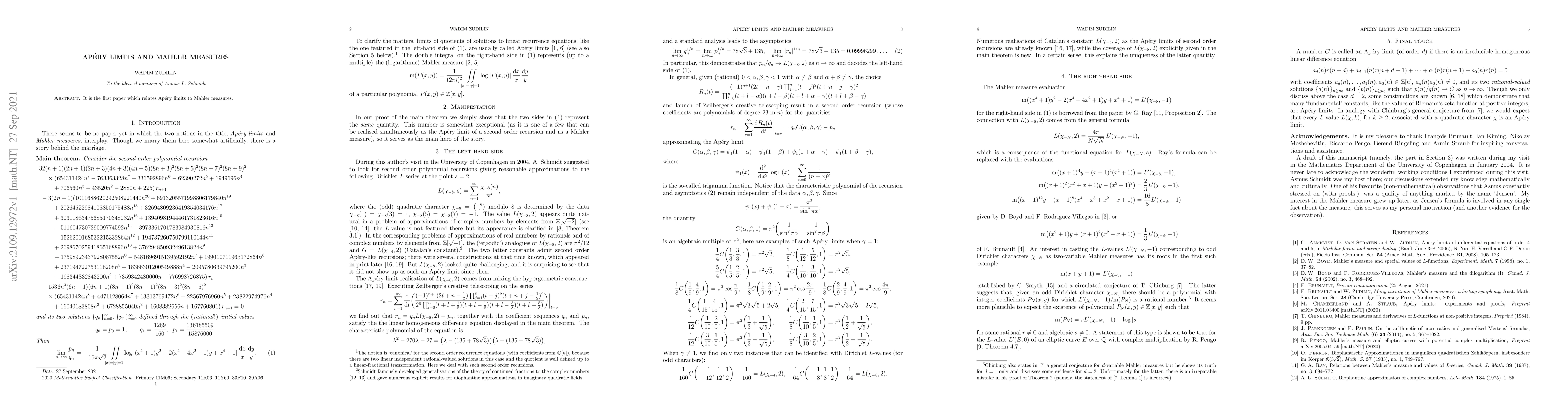 Summary: This pioneering paper establishes a novel connection between Apéry limits and Mahler measures, marking a significant advancement in the study of these mathematical concepts. The relationship uncovered opens new avenues for research in both fields.