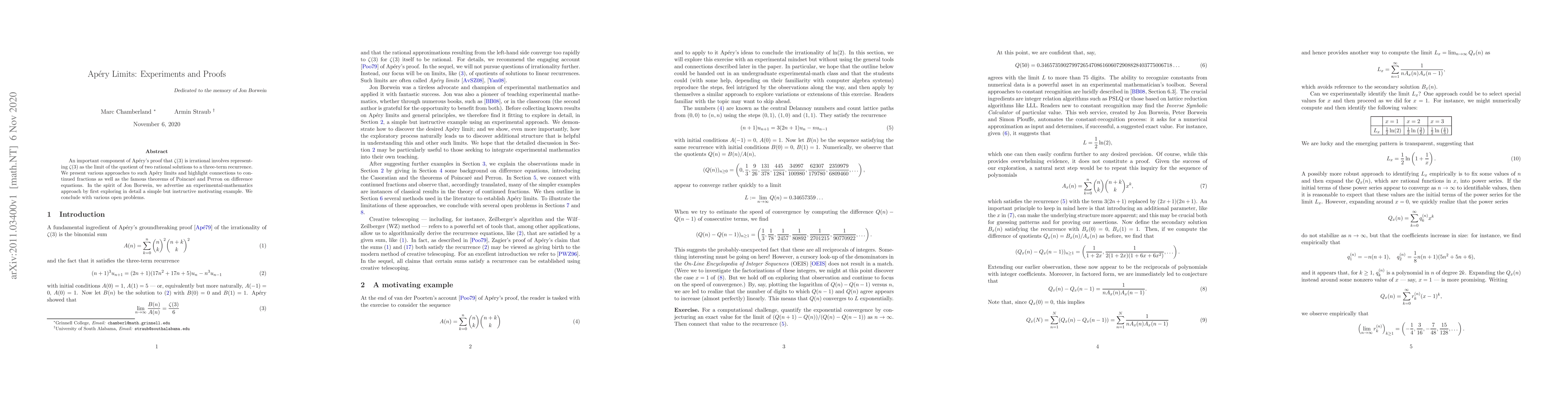 An important component of Ap\'ery's proof that $\zeta (3)$ is irrational involves representing $\zeta (3)$ as the limit of the quotient of two rational solutions to a three-term recurrence. We present various approaches to such Ap\'ery limits and highlight connections to continued fractions as well as the famous theorems of Poincar\'e and Perron on difference equations. In the spirit of Jon Borwein, we advertise an experimental-mathematics approach by first exploring in detail a simple but instructive motivating example. We conclude with various open problems.
