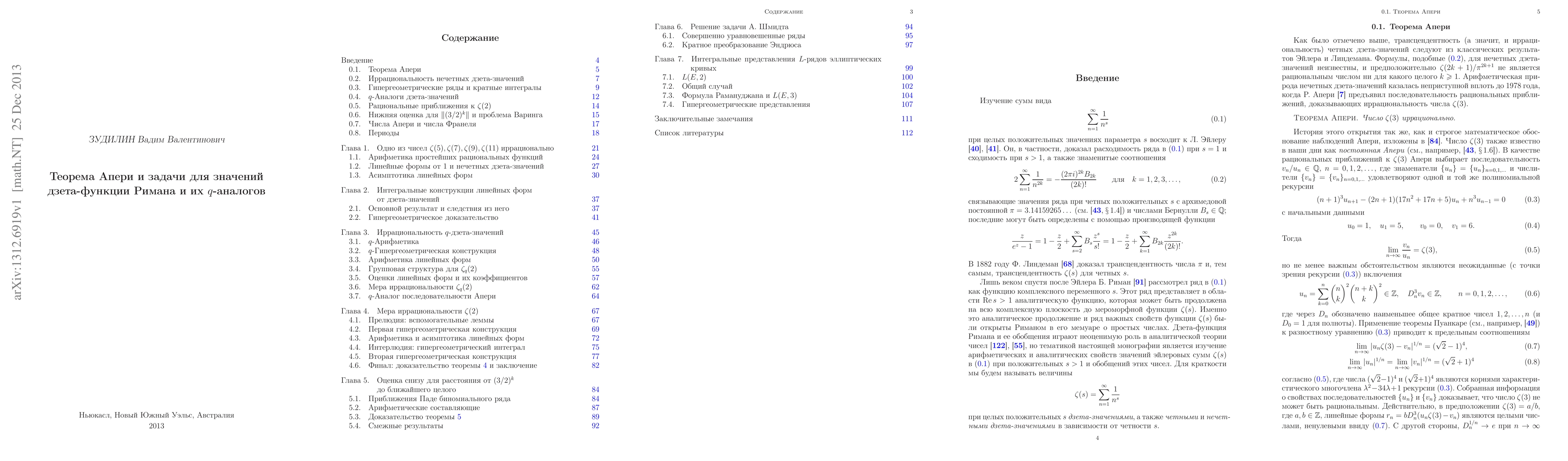 This monograph explores Apéry's theorem on the irrationality of $\zeta(2)$ and $\zeta(3)$ and extends its implications to values of the Riemann zeta function and their $q$-analogues, including irrationality proofs and estimates for various zeta values. It also addresses connections between hypergeometric series and generalized multiple integrals.