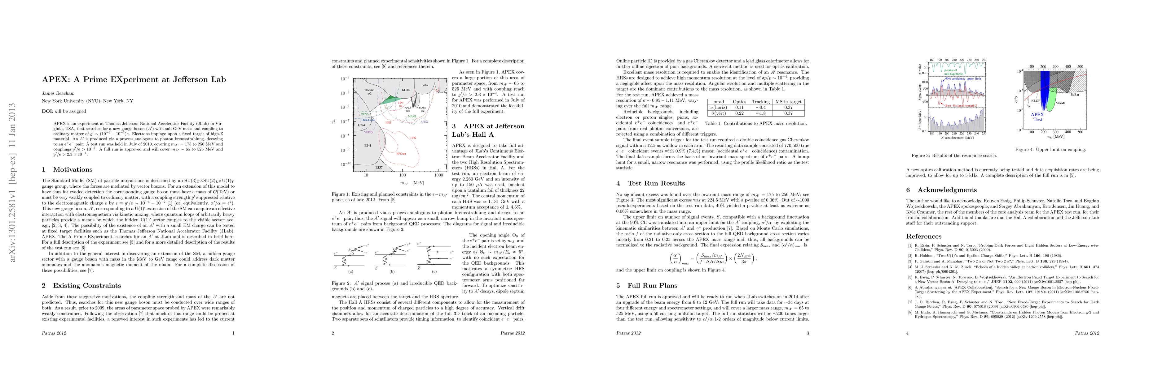 APEX is an experiment at Thomas Jefferson National Accelerator Facility (JLab) in Virginia, USA, that searches for a new gauge boson ($A^\prime$) with sub-GeV mass and coupling to ordinary matter of $g^\prime \sim (10^{-6} - 10^{-2}) e$. Electrons impinge upon a fixed target of high-Z material. An $A^\prime$ is produced via a process analogous to photon bremsstrahlung, decaying to an $e^+ e^-$ pair. A test run was held in July of 2010, covering $m_{A^\prime}$ = 175 to 250 MeV and couplings $g^\prime/e \; \textgreater \; 10^{-3}$. A full run is approved and will cover $m_{A^\prime} \sim$ 65 to 525 MeV and $g^\prime/e \; \textgreater \; 2.3 \times10^{-4}$.