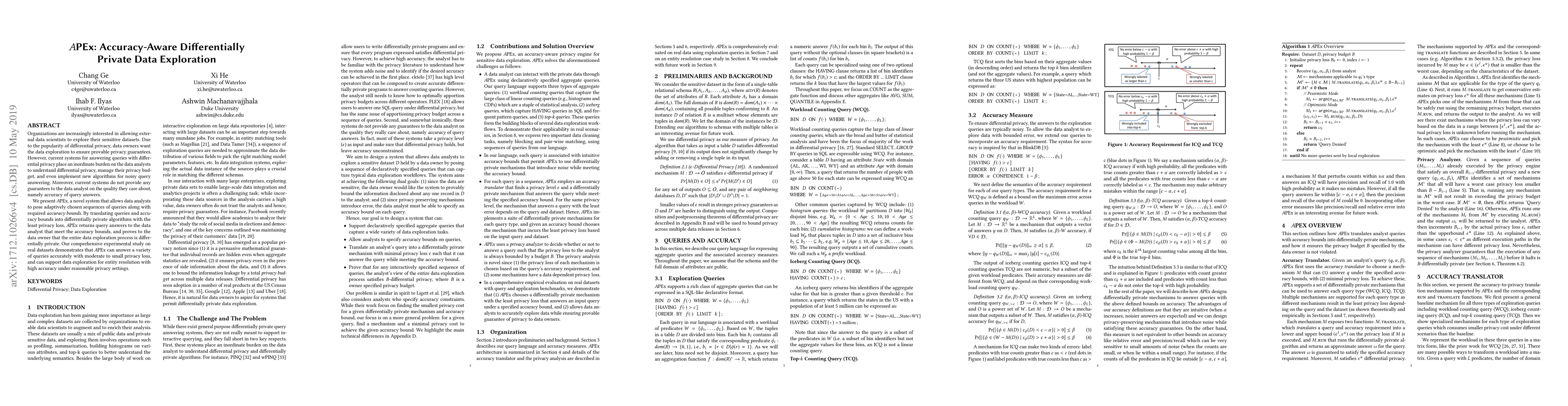 APEx is a system designed to facilitate data exploration with differential privacy, allowing analysts to specify accuracy bounds while minimizing privacy loss. It translates queries and accuracy requirements into differentially private algorithms, ensuring both privacy and query accuracy for sensitive datasets.