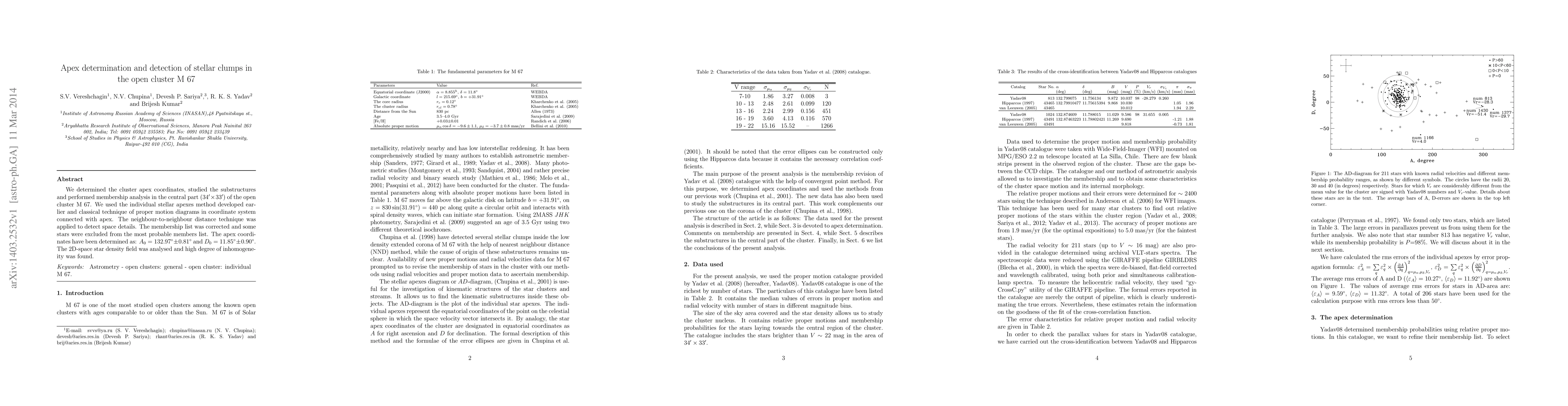 We determined the cluster apex coordinates, studied the substructures and performed membership analysis in the central part (34'X33') of the open cluster M 67. We used the individual stellar apexes method developed earlier and classical technique of proper motion diagrams in coordinate system connected with apex. The neighbour-to-neighbour distance technique was applied to detect space details. The membership list was corrected and some stars were excluded from the most probable members list. The apex coordinates have been determined as: A0=132.97deg+/-0.81deg and D0=11.85deg+/-0.90deg. The 2D-space star density field was analysed and high degree of inhomogeneity was found.