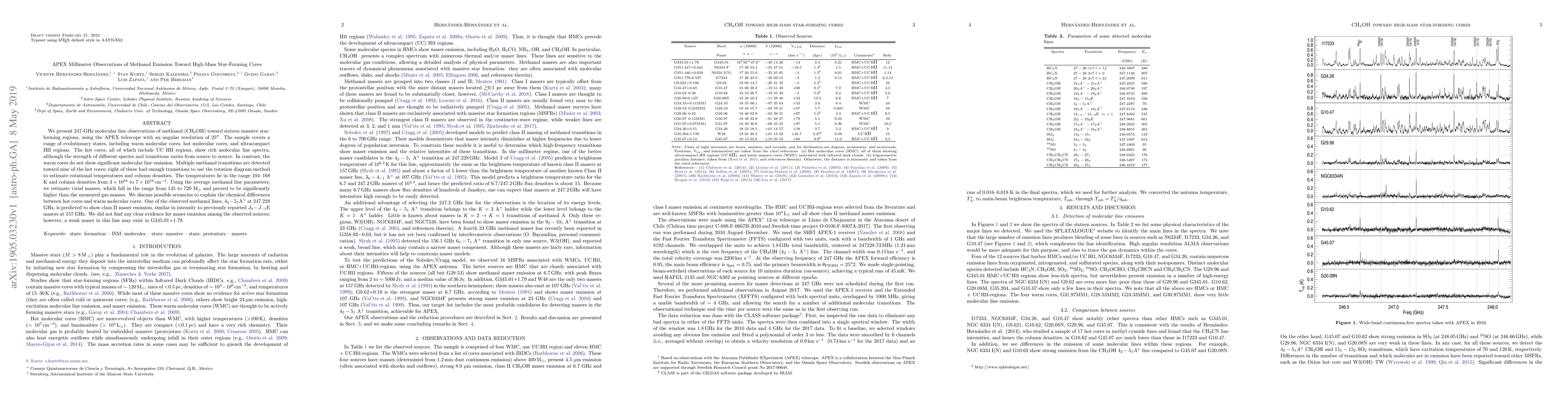 We present 247-GHz molecular line observations of methanol (CH$_3$OH) toward sixteen massive star-forming regions, using the APEX telescope with an angular resolution of $25''$. The sample covers a range of evolutionary states, including warm molecular cores, hot molecular cores, and ultracompact HII regions. The hot cores, all of which include UC HII regions, show rich molecular line spectra, although the strength of different species and transitions varies from source to source. In contrast, the warm cores do not show significant molecular line emission. Multiple methanol transitions are detected toward nine of the hot cores; eight of these had enough transitions to use the rotation diagram method to estimate rotational temperatures and column densities. The temperatures lie in the range 104$-$168 K and column densities from $3\times10^{16}$ to $7\times10^{18}$ cm$^{-2}$. Using the average methanol line parameters, we estimate virial masses, which fall in the range from 145 to 720 M$_\odot$ and proved to be significantly higher than the measured gas masses. We discuss possible scenarios to explain the chemical differences between hot cores and warm molecular cores. One of the observed methanol lines, $4_{2}-5_{1}A^{+}$ at 247.228 GHz, is predicted to show class II maser emission, similar in intensity to previously reported $J_0-J_{-1}E$ masers at 157 GHz. We did not find any clear evidence for maser emission among the observed sources; however, a weak maser in this line may exist in G345.01+1.79.