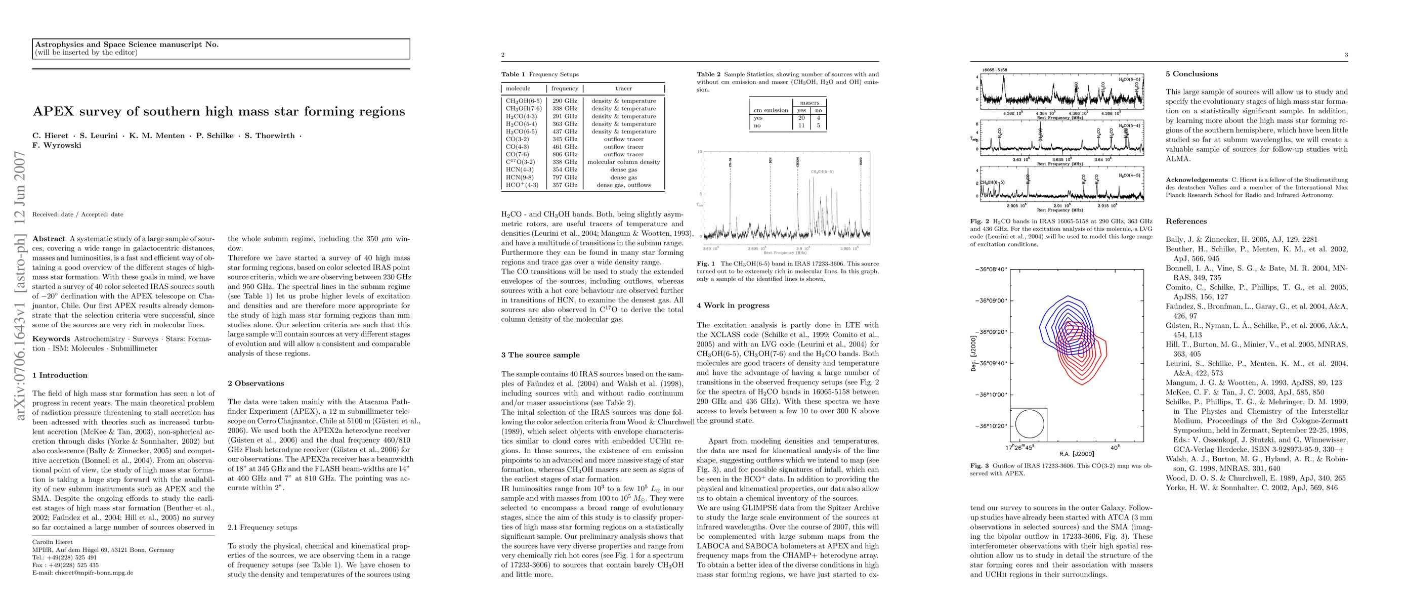 A systematic study of a large sample of sources, covering a wide range in galactocentric distances, masses and luminosities, is a fast and efficient way of obtaining a good overview of the different stages of high-mass star formation. With these goals in mind, we have started a survey of 40 color selected IRAS sources south of -20 degrees declination with the APEX telescope on Chajnantor, Chile. Our first APEX results already demonstrate that the selection criteria were successful, since some of the sources are very rich in molecular lines.