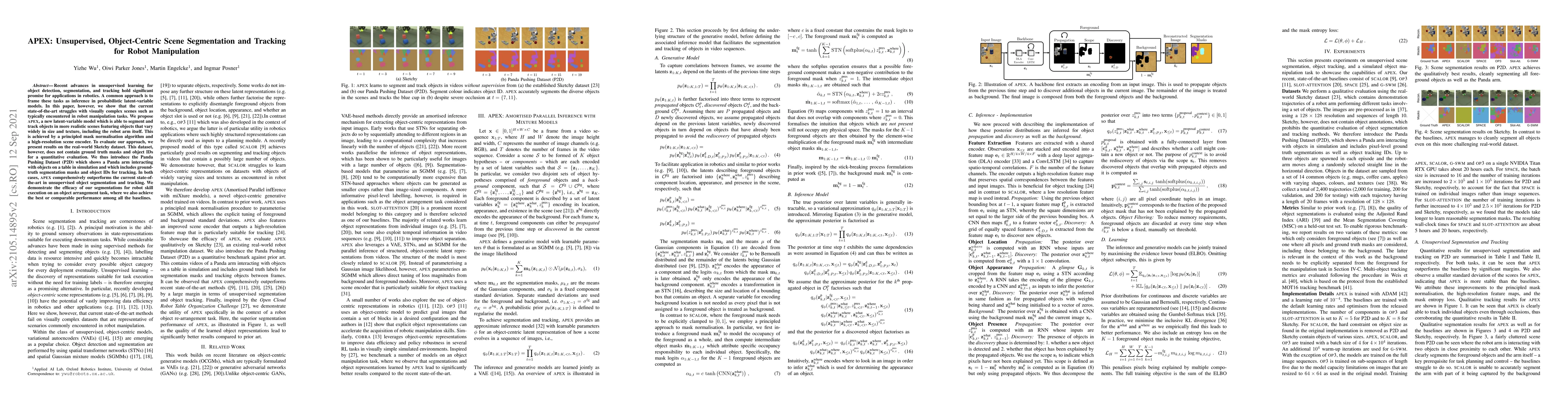 APEX introduces a novel latent-variable model for unsupervised, object-centric scene segmentation and tracking, outperforming current state-of-the-art methods in complex scenes. It leverages a mask normalization algorithm and high-resolution scene encoder, and is evaluated on both the Sketchy and newly introduced Panda Pushing Datasets.