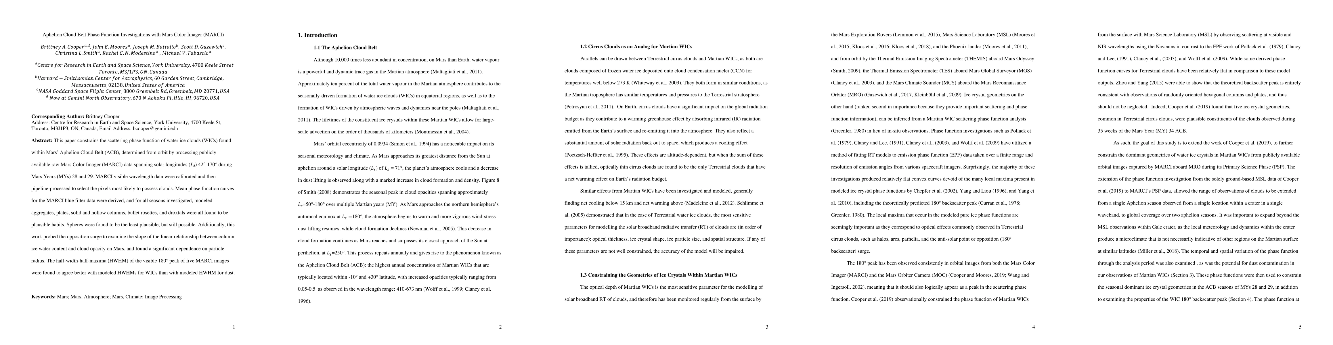 This study investigates the scattering phase function of water ice clouds in Mars' Aphelion Cloud Belt using MARCI data, finding that various cloud shapes are plausible, while spheres are less likely. It also reveals a significant relationship between particle radius and cloud opacity, with MARCI's visible peak widths aligning better with water ice cloud models than dust.