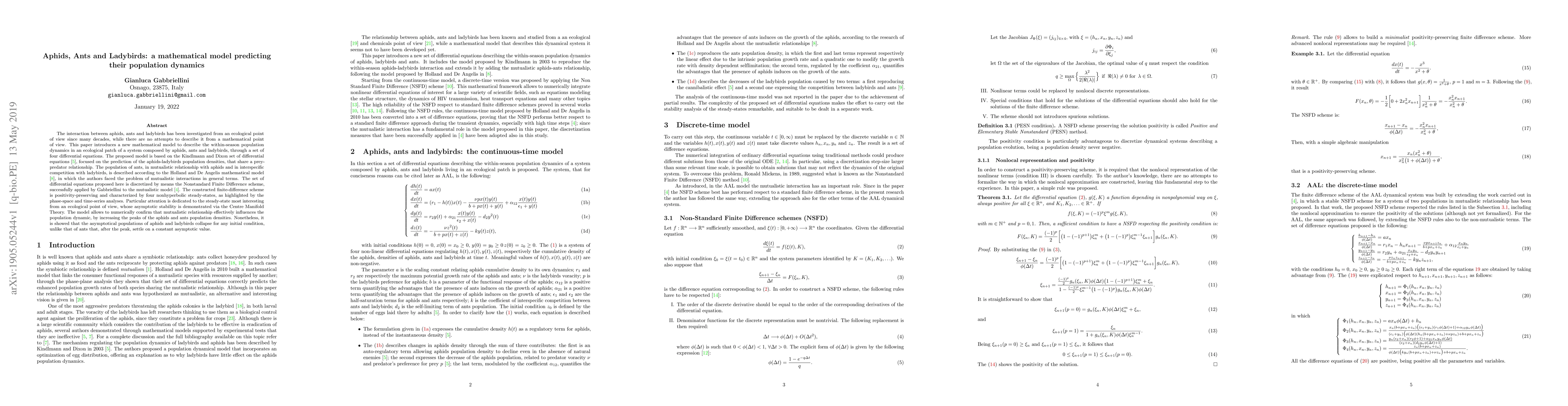 The interaction between aphids, ants and ladybirds has been investigated from an ecological point of view since many decades, while there are no attempts to describe it from a mathematical point of view. This paper introduces a new mathematical model to describe the within-season population dynamics in an ecological patch of a system composed by aphids, ants and ladybirds, through a set of four differential equations. The proposed model is based on the Kindlmann and Dixon set of differential equations, focused on the prediction of the aphids-ladybirds population densities, that share a prey-predator relationship. The population of ants, in mutualistic relationship with aphids and in interspecific competition with ladybirds, is described according to the Holland and De Angelis mathematical model, in which the authors faced the problem of mutualistic interactions in general terms. The set of differential equations proposed here is discretized by means the Nonstandard Finite Difference scheme, successfully applied by Gabbriellini to the mutualistic model. The constructed finite-difference scheme is positivity-preserving and characterized by four nonhyperbolic steady-states, as highlighted by the phase-space and time-series analyses. Particular attention is dedicated to the steady-state most interesting from an ecological point of view, whose asymptotic stability is demonstrated via the Centre Manifold Theory. The model allows to numerically confirm that mutualistic relationship effectively influences the population dynamic, by increasing the peaks of the aphids and ants population densities. Nonetheless, it is showed that the asymptotical populations of aphids and ladybirds collapse for any initial condition, unlike that of ants that, after the peak, settle on a constant asymptotic value.