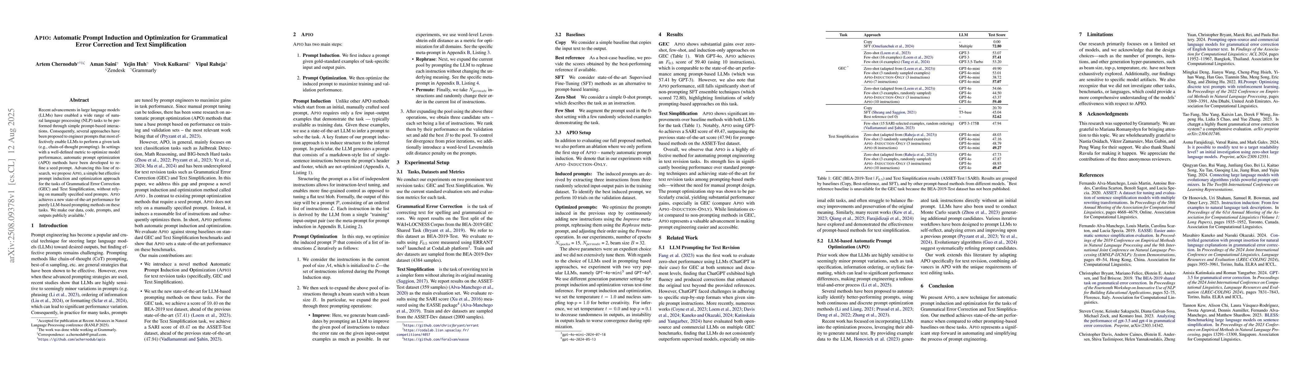 Recent advancements in large language models (LLMs) have enabled a wide range of natural language processing (NLP) tasks to be performed through simple prompt-based interactions. Consequently, several approaches have been proposed to engineer prompts that most effectively enable LLMs to perform a given task (e.g., chain-of-thought prompting). In settings with a well-defined metric to optimize model performance, automatic prompt optimization (APO) methods have been developed to refine a seed prompt. Advancing this line of research, we propose APIO, a simple but effective prompt induction and optimization approach for the tasks of Grammatical Error Correction (GEC) and Text Simplification, without relying on manually specified seed prompts. APIO achieves a new state-of-the-art performance for purely LLM-based prompting methods on these tasks. We make our data, code, prompts, and outputs publicly available.