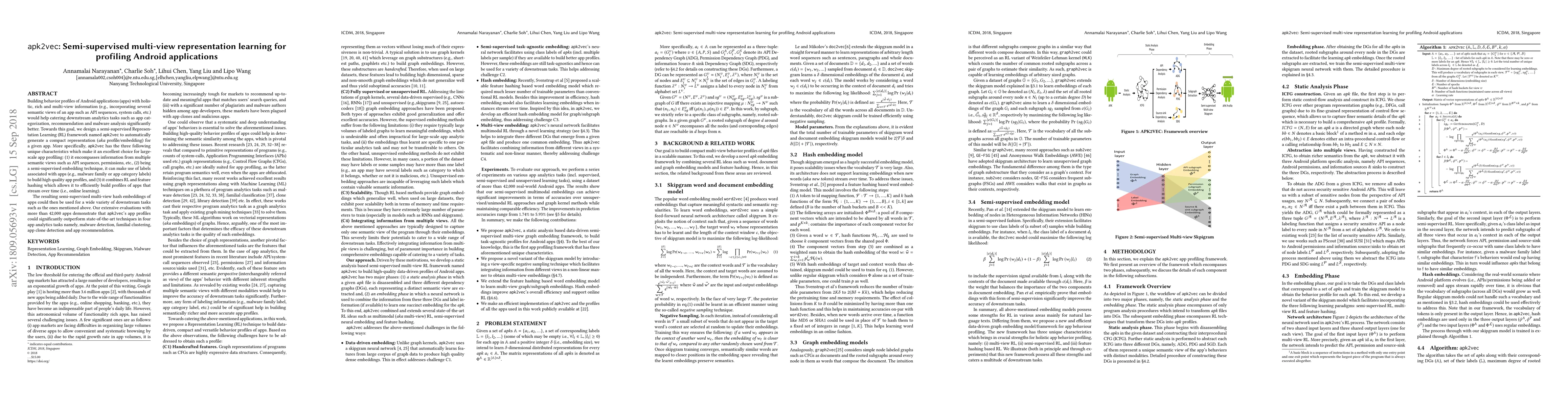 The apk2vec framework employs semi-supervised multi-view representation learning for profiling Android applications, integrating various semantic views to generate compact app embeddings. These embeddings outperform existing methods in tasks like malware detection, familial clustering, clone detection, and app recommendation.