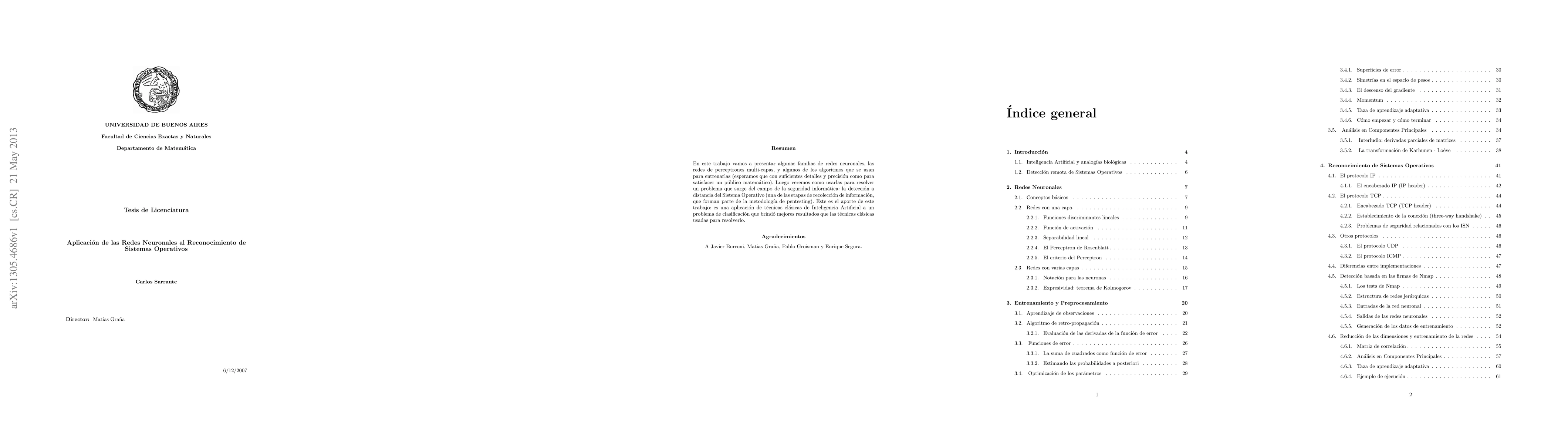 In this work we present a family of neural networks, the multi-layer perceptron networks, and some of the algorithms used to train those networks (we hope that with enough details and precision as to satisfy a mathematical public). Then we study how to use those networks to solve a problem that arises from the field of information security: the remote identification of Operating Systems (part of the information gathering steps of the penetration testing methodology). This is the contribution of this work: it is an application of classic Artificial Intelligence techniques to a classification problem that gave better results than the classic techniques used to solve it.
