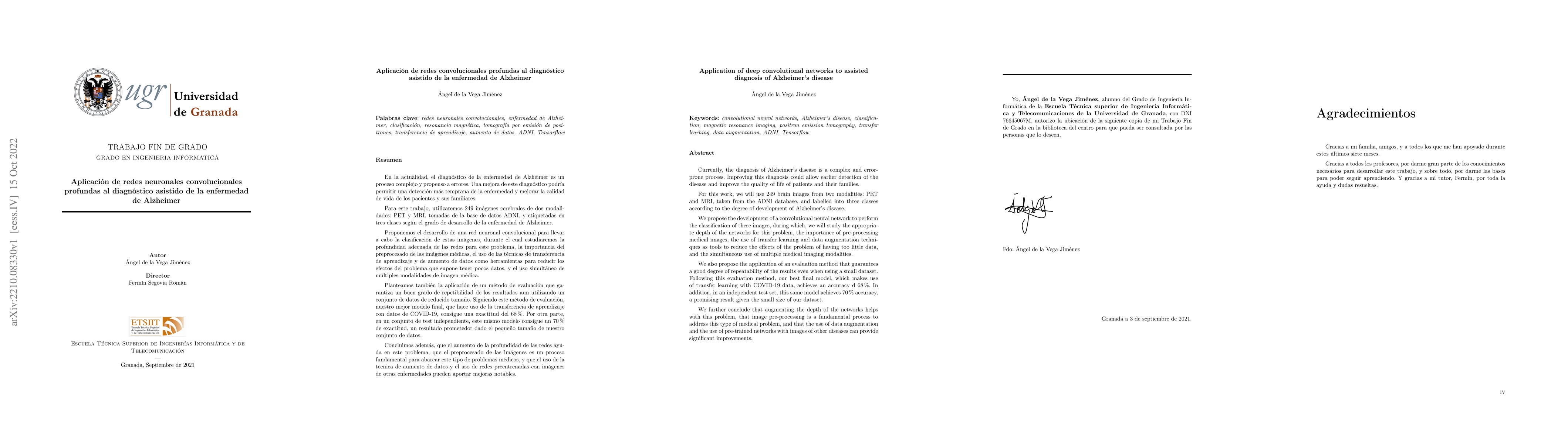 Currently, the diagnosis of Alzheimer's disease is a complex and error-prone process. Improving this diagnosis could allow earlier detection of the disease and improve the quality of life of patients and their families. For this work, we will use 249 brain images from two modalities: PET and MRI, taken from the ADNI database, and labelled into three classes according to the degree of development of Alzheimer's disease. We propose the development of a convolutional neural network to perform the classification of these images, during which, we will study the appropriate depth of the networks for this problem, the importance of pre-processing medical images, the use of transfer learning and data augmentation techniques as tools to reduce the effects of the problem of having too little data, and the simultaneous use of multiple medical imaging modalities. We also propose the application of an evaluation method that guarantees a good degree of repeatability of the results even when using a small dataset. Following this evaluation method, our best final model, which makes use of transfer learning with COVID-19 data, achieves an accuracy d 68\%. In addition, in an independent test set, this same model achieves 70\% accuracy, a promising result given the small size of our dataset. We further conclude that augmenting the depth of the networks helps with this problem, that image pre-processing is a fundamental process to address this type of medical problem, and that the use of data augmentation and the use of pre-trained networks with images of other diseases can provide significant improvements.