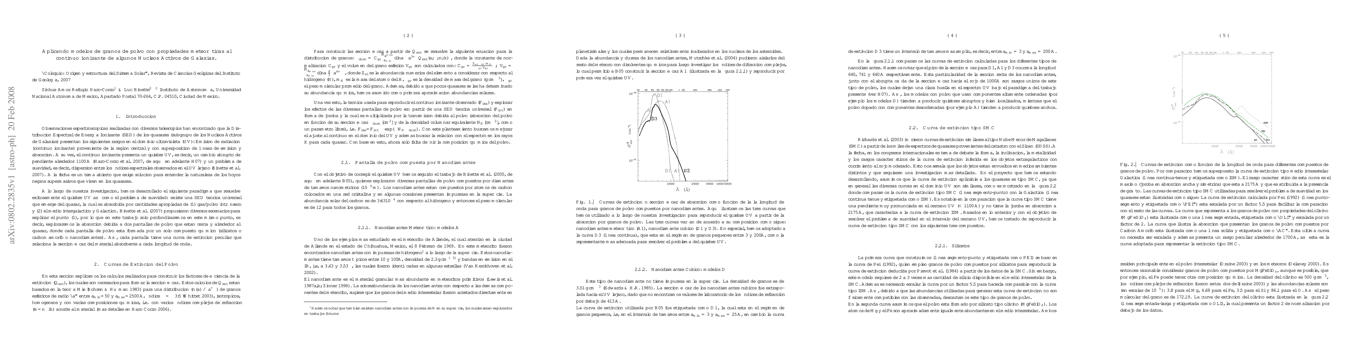 We construct extinction curves based on Mie's theory for spherical dust grain with size distributions between 50-2500 A and composed by elements found in meteorites. We explore the issue of whether the observed spectral energy distribution might be dust absorbed in the far and near-UV by this kind of dust grains. Using this approach, satisfactory fits to the 11 spectra can be obtained. ----- En este trabajo, presentamos las diversas curvas de extincion que hemos calculado con base a la teoria Mie para granos de polvo esfericos, con distribuciones de acuerdo a su tamano (entre 50-2500 A) y con diversos compuestos quimicos hallados en meteoritos. Bajo el posible paradigma que hemos desarrollado, estas curvas de extincion al ser aplicadas a un continuo ionizante teorico y comparadas con 11 espectros observados de quasares, hemos encontrado de manera exitosa reproducir tanto el quiebre UV asi como el problema de suavidad presentes en el continuo ionizante de algunos Nucleos Activos de Galaxias.