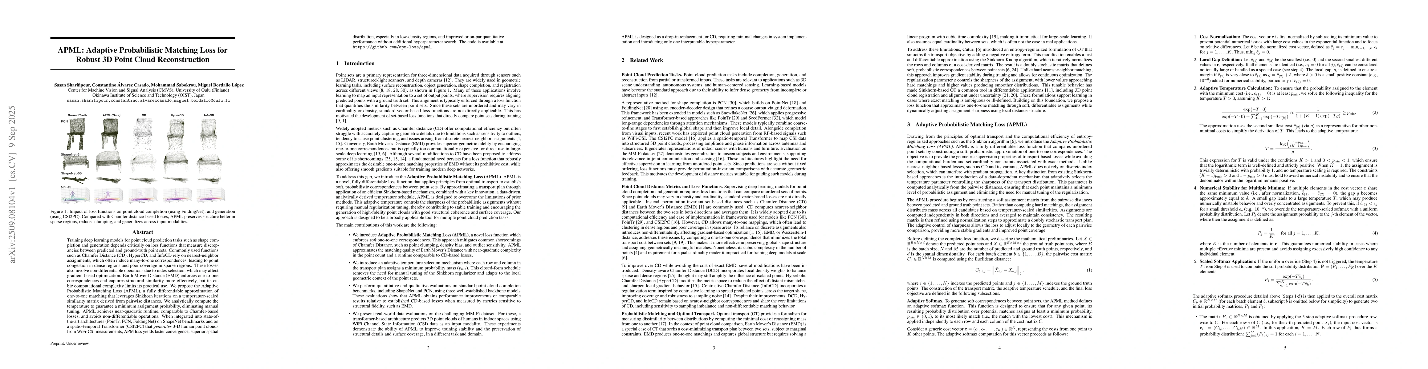 Training deep learning models for point cloud prediction tasks such as shape completion and generation depends critically on loss functions that measure discrepancies between predicted and ground-truth point sets. Commonly used functions such as Chamfer Distance (CD), HyperCD, and InfoCD rely on nearest-neighbor assignments, which often induce many-to-one correspondences, leading to point congestion in dense regions and poor coverage in sparse regions. These losses also involve non-differentiable operations due to index selection, which may affect gradient-based optimization. Earth Mover Distance (EMD) enforces one-to-one correspondences and captures structural similarity more effectively, but its cubic computational complexity limits its practical use. We propose the Adaptive Probabilistic Matching Loss (APML), a fully differentiable approximation of one-to-one matching that leverages Sinkhorn iterations on a temperature-scaled similarity matrix derived from pairwise distances. We analytically compute the temperature to guarantee a minimum assignment probability, eliminating manual tuning. APML achieves near-quadratic runtime, comparable to Chamfer-based losses, and avoids non-differentiable operations. When integrated into state-of-the-art architectures (PoinTr, PCN, FoldingNet) on ShapeNet benchmarks and on a spatiotemporal Transformer (CSI2PC) that generates 3D human point clouds from WiFi CSI measurements, APM loss yields faster convergence, superior spatial distribution, especially in low-density regions, and improved or on-par quantitative performance without additional hyperparameter search. The code is available at: https://github.com/apm-loss/apml.