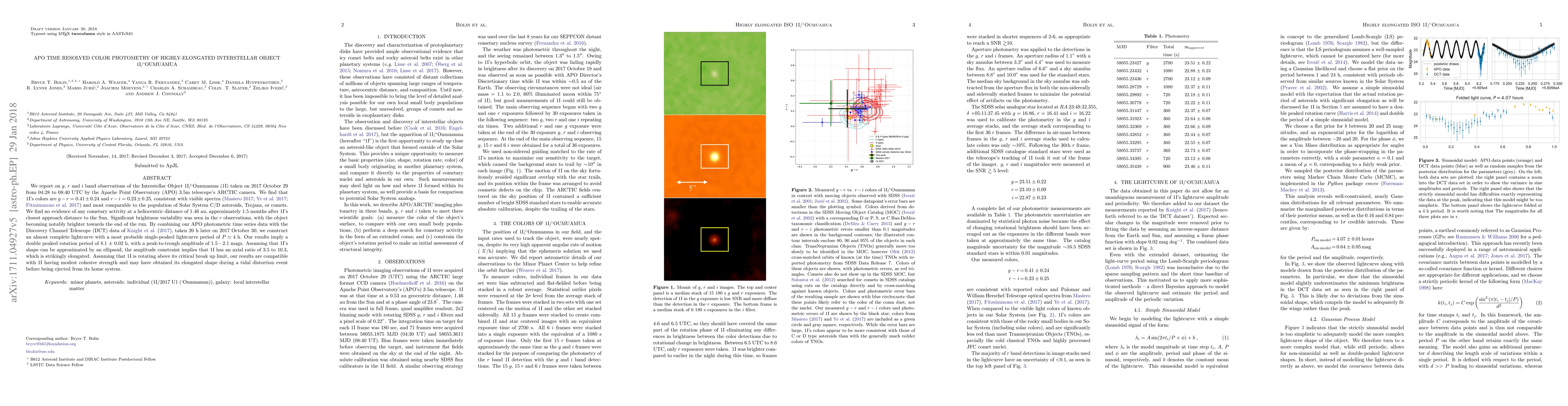 We report on $g$, $r$ and $i$ band observations of the Interstellar Object 'Oumuamua (1I) taken on 2017 October 29 from 04:28 to 08:40 UTC by the Apache Point Observatory (APO) 3.5m telescope's ARCTIC camera. We find that 1I's colors are $g-r=0.41\pm0.24$ and $r-i=0.23\pm0.25$, consistent with the visible spectra of Masiero (2017), Ye et al. (2017) and Fitzsimmons et al. (2017), and most comparable to the population of Solar System C/D asteroids, Trojans, or comets. We find no evidence of any cometary activity at a heliocentric distance of 1.46 au, approximately 1.5 months after 1I's closest approach distance to the Sun. Significant brightness variability was seen in the $r$ observations, with the object becoming notably brighter towards the end of the run. By combining our APO photometric time series data with the Discovery Channel Telescope (DCT) data of Knight et al. (2017), taken 20 h later on 2017 October 30, we construct an almost complete light curve with a most probable lightcurve period of $P \simeq 4~{\rm h}$. Our results imply a double peaked rotation period of 8.1 $\pm$ 0.02 h, with a peak-to-peak amplitude of 1.5 - 2.1 mags. Assuming that 1I's shape can be approximated by an ellipsoid, the amplitude constraint implies that 1I has an axial ratio of 3.5 to 10.3, which is strikingly elongated. Assuming that 1I is rotating above its critical break up limit, our results are compatible with 1I having having modest cohesive strength and may have obtained its elongated shape during a tidal disruption event before being ejected from its home system. Astrometry useful for constraining 1I's orbit was also obtained and published in Weaver et al. (2017).