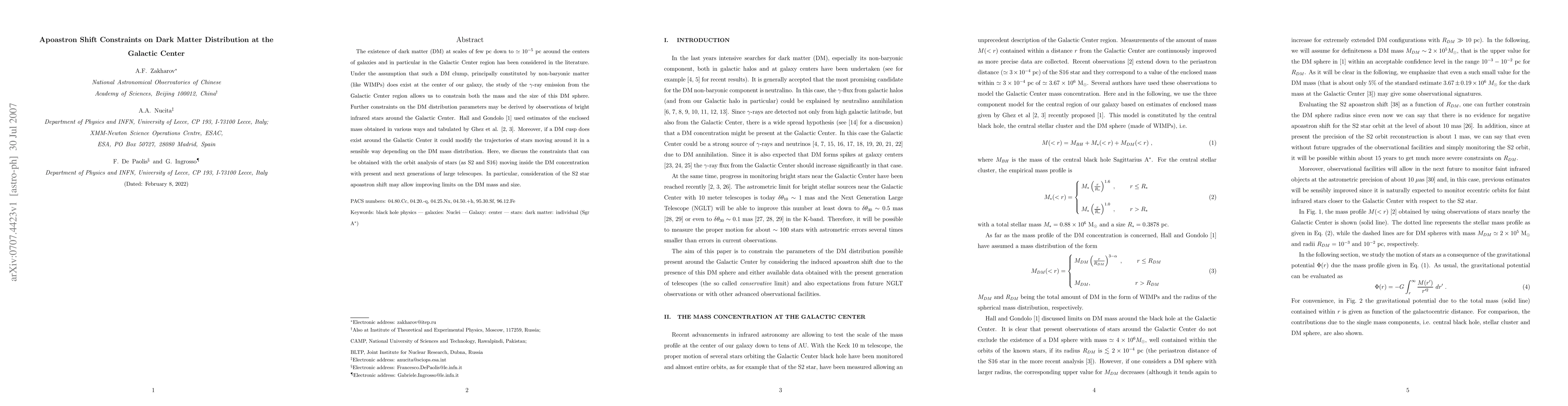 This paper investigates the constraints on dark matter distribution at the Galactic Center by analyzing the apoastron shift of stars, such as S2, using current and future large telescopes. The study aims to refine limits on the mass and size of dark matter clumps through precise orbit measurements.