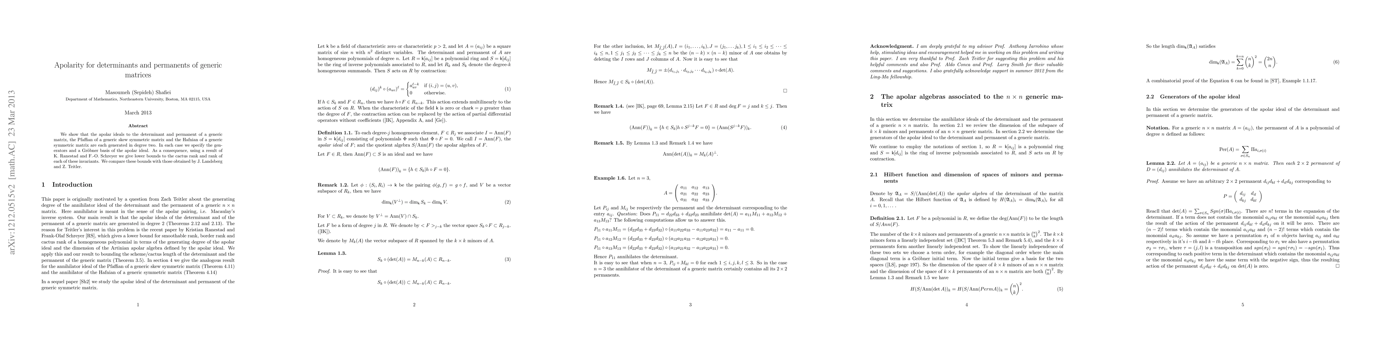We show that the apolar ideals to the determinant and permanent of a generic matrix, the Pfaffian of a generic skew symmetric matrix and the Hafnian of a generic symmetric matrix are each generated in degree two. In each case we specify the generators and a Gr\"{o}bner basis of the apolar ideal. As a consequence, using a result of K. Ranestad and F. O. Schreyer we give lower bounds to the cactus rank and rank of each of these invariants. We compare these bounds with those obtained by J. Landsberg and Z. Teitler.