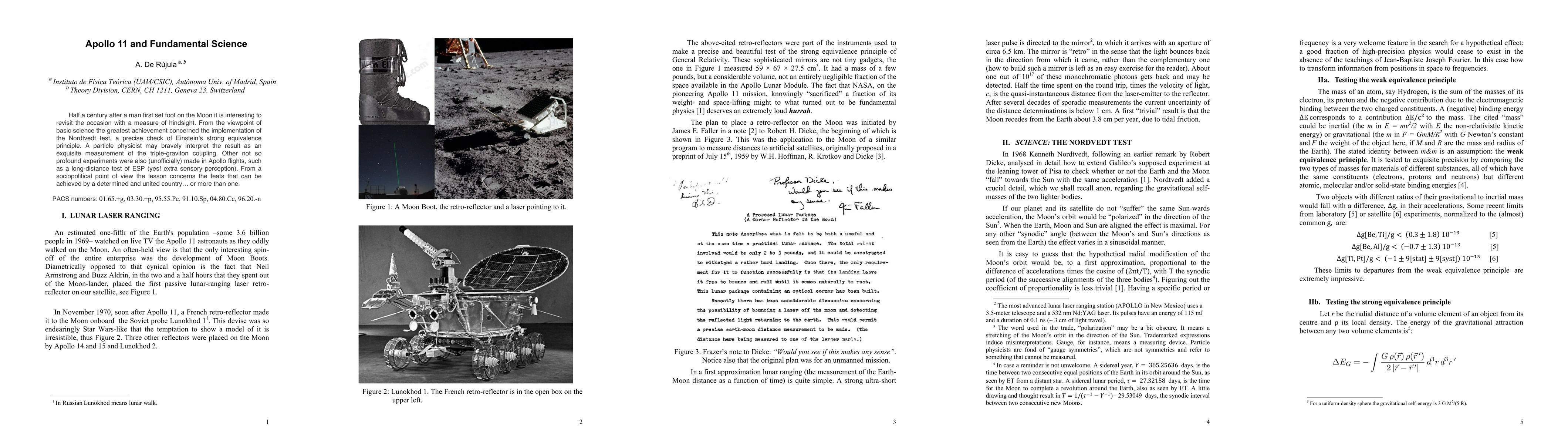 Half a century after a man first set foot on the moon it is interesting to revisit the occasion with a measure of hindsight. From the point of view of basic science the greatest achievement concerned the implementation of the Nordtvedt test, a precise check of Einstein's strong equivalence principle. A particle physicist may bravely interpret the result as a precise measurement of the triple-graviton coupling. Other not so profound experiments were also (unofficially) made in Apollo flights, such as a long-distance test of ESP (yes! extra sensory perception). From a sociopolitical point of view the lesson concerns the feats that can be achieved by a determined and united country... or more than one.