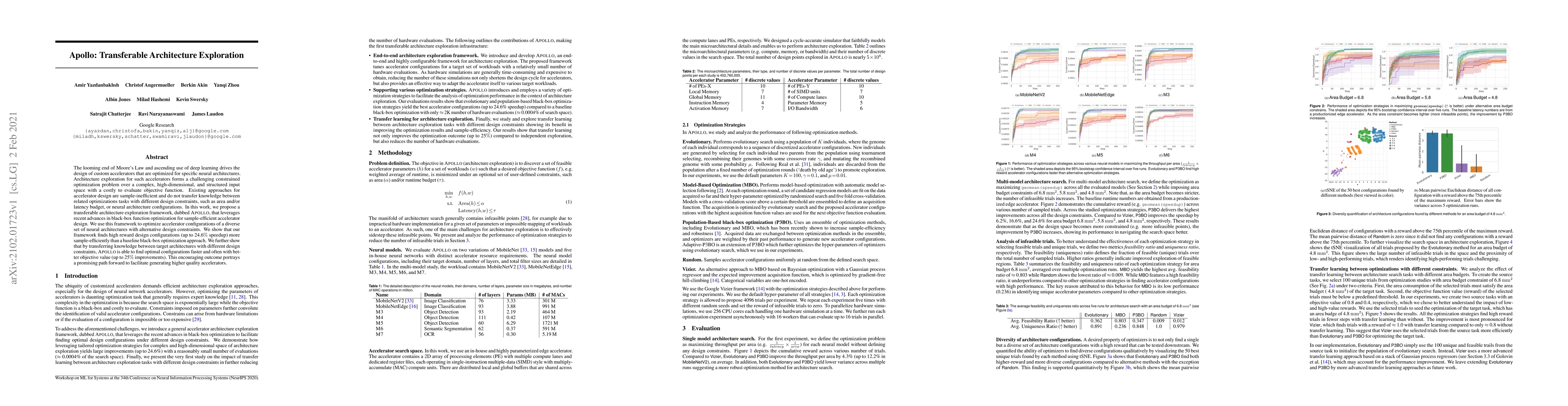 The looming end of Moore's Law and ascending use of deep learning drives the design of custom accelerators that are optimized for specific neural architectures. Architecture exploration for such accelerators forms a challenging constrained optimization problem over a complex, high-dimensional, and structured input space with a costly to evaluate objective function. Existing approaches for accelerator design are sample-inefficient and do not transfer knowledge between related optimizations tasks with different design constraints, such as area and/or latency budget, or neural architecture configurations. In this work, we propose a transferable architecture exploration framework, dubbed Apollo, that leverages recent advances in black-box function optimization for sample-efficient accelerator design. We use this framework to optimize accelerator configurations of a diverse set of neural architectures with alternative design constraints. We show that our framework finds high reward design configurations (up to 24.6% speedup) more sample-efficiently than a baseline black-box optimization approach. We further show that by transferring knowledge between target architectures with different design constraints, Apollo is able to find optimal configurations faster and often with better objective value (up to 25% improvements). This encouraging outcome portrays a promising path forward to facilitate generating higher quality accelerators.