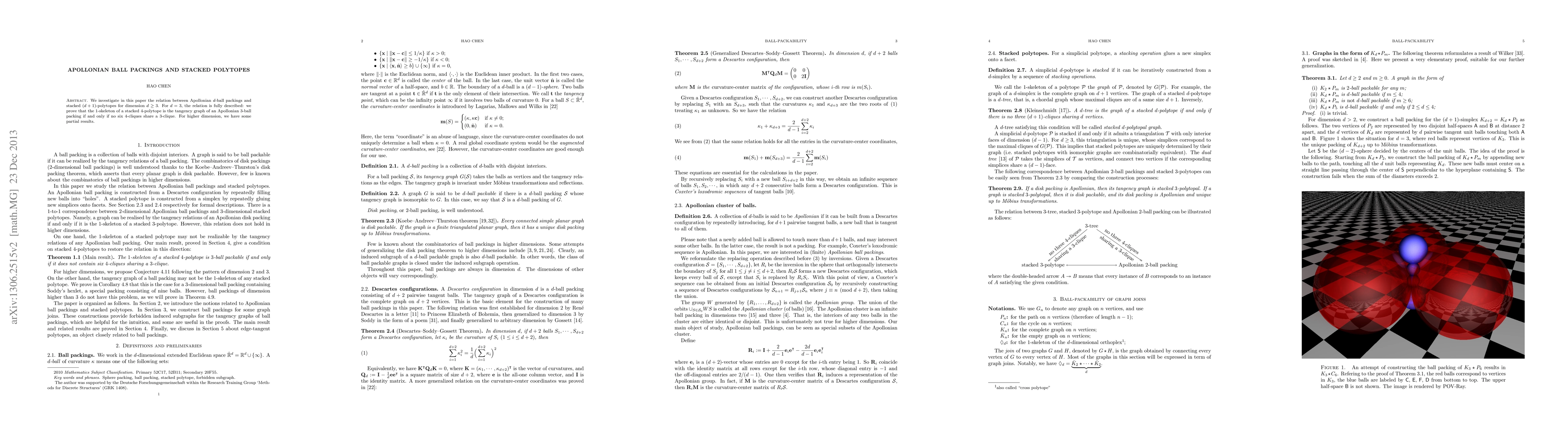 This paper explores the connection between Apollonian $d$-ball packings and stacked $(d+1)$-polytopes in dimensions $d\ge 3$, fully describing the relationship for $d=3$ and presenting partial results for higher dimensions.