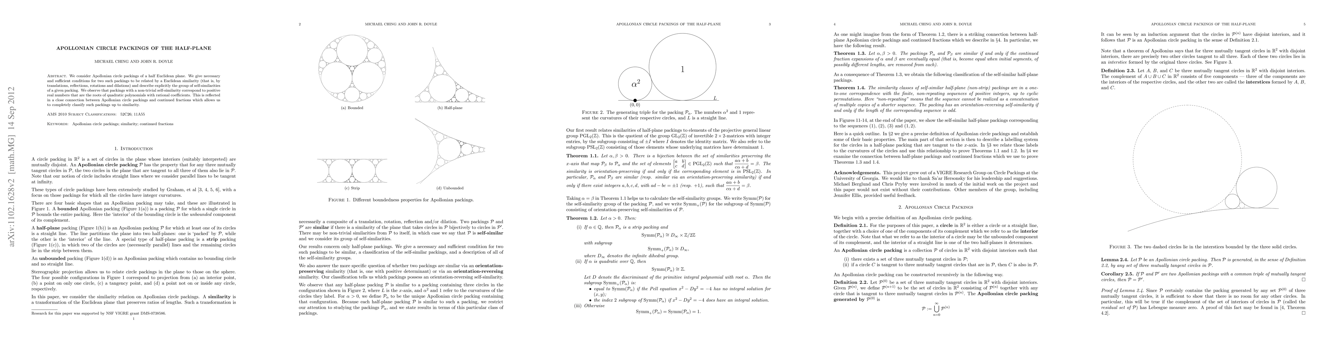 This paper explores Apollonian circle packings in a half-plane, establishing conditions for their Euclidean similarity and describing the self-similarity group. It links these packings to quadratic polynomials and continued fractions, ultimately classifying them up to similarity.