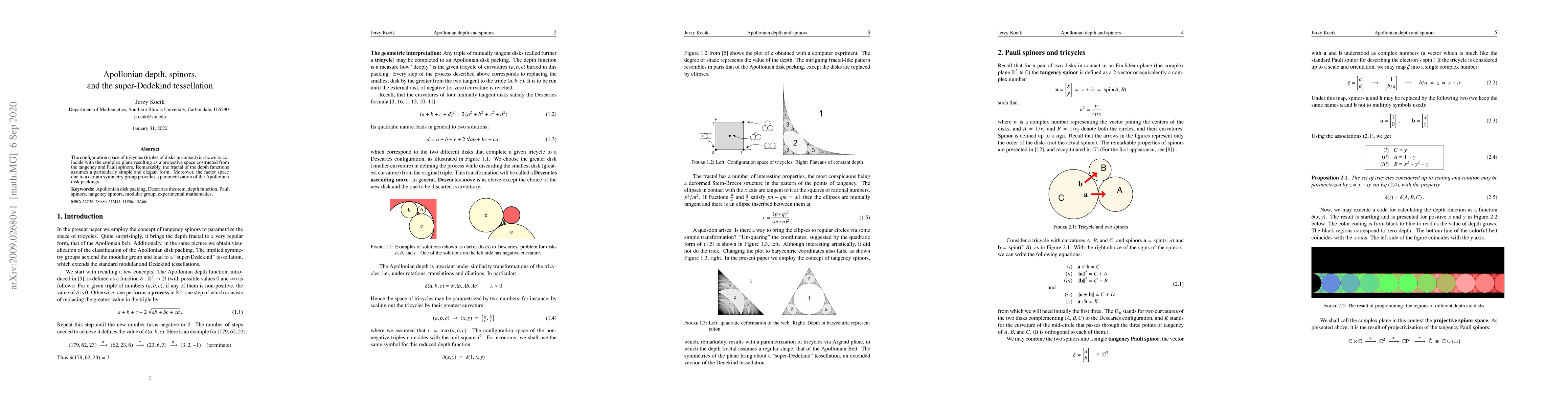 This research identifies that tricycle configurations in contact, described by Apollonian depth functions, align with the complex plane constructed from Pauli spinors. The study reveals that these depth functions form a simple fractal, and a symmetry group's factor space offers a parameterization for Apollonian disk packings.