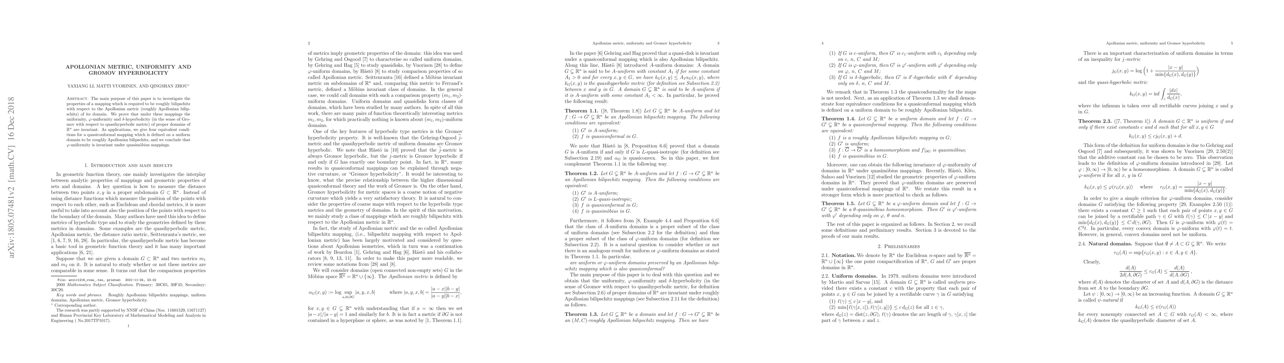 The main purpose of this paper is to investigate the properties of a mapping which is required to be roughly bilipschitz with respect to the Apollonian metric (roughly Apollonian bilipschitz) of its domain. We prove that under these mappings the uniformity, $\varphi$-uniformity and $\delta$-hyperbolicity (in the sense of Gromov with respect to quasihyperbolic metric) of proper domains of $\mathbb{R}^n$ are invariant. As applications, we give four equivalent conditions for a quasiconformal mapping which is defined on a uniform domain to be roughly Apollonian bilipschitz, and we conclude that $\varphi$-uniformity is invariant under quasim\"obius mappings.