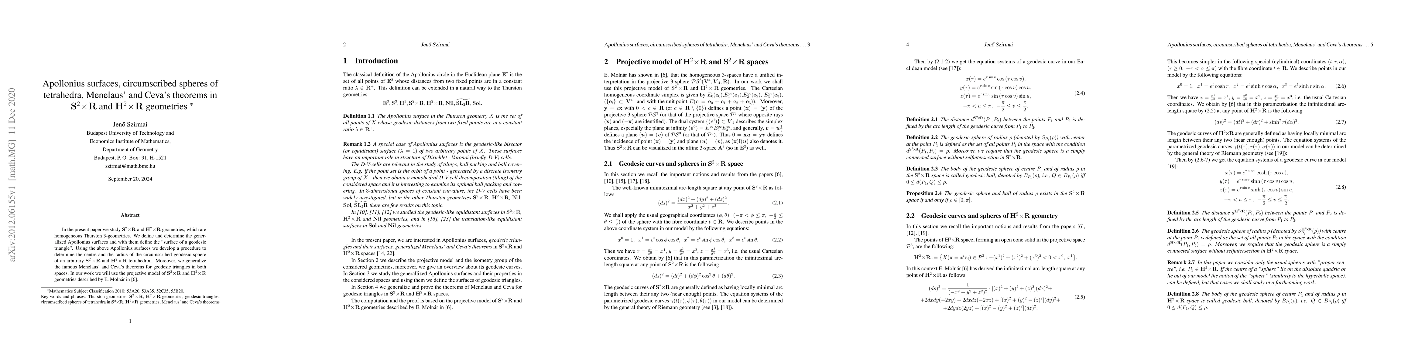 The paper introduces a method for defining and determining generalized Apollonius surfaces in $\SXR$ and $\HXR$ geometries, along with a procedure for finding the circumscribed geodesic sphere of tetrahedra in these spaces.