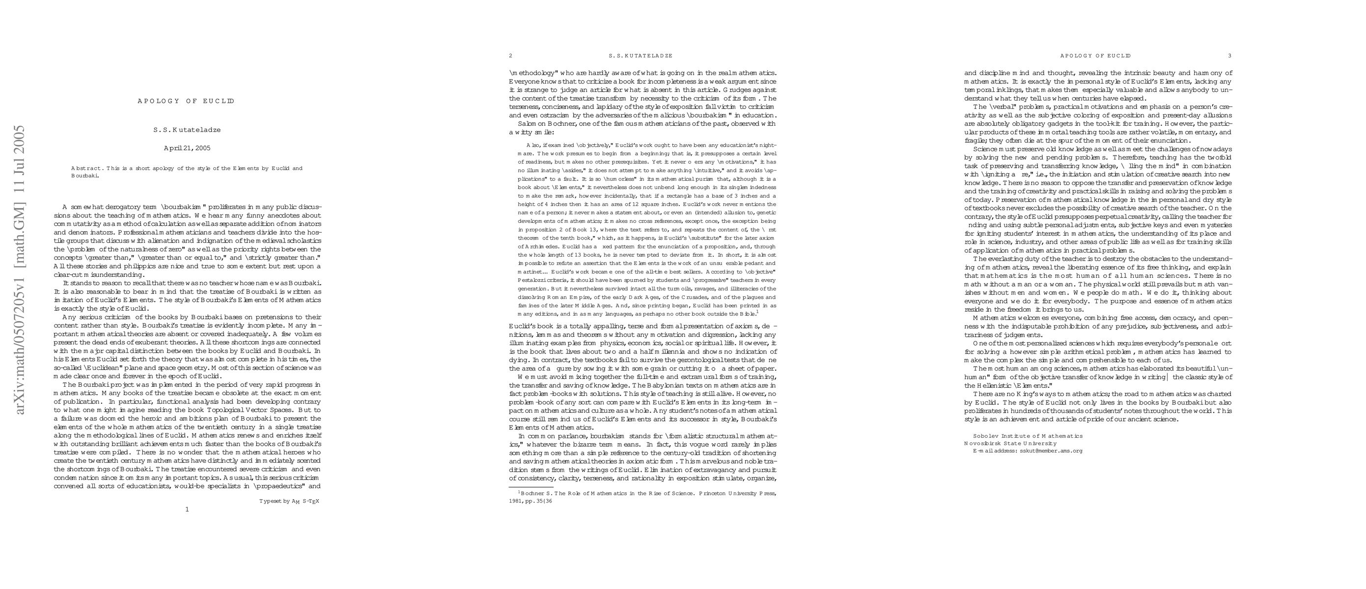 This is a short apology of the style of the Elements by Euclid and Bourbaki.