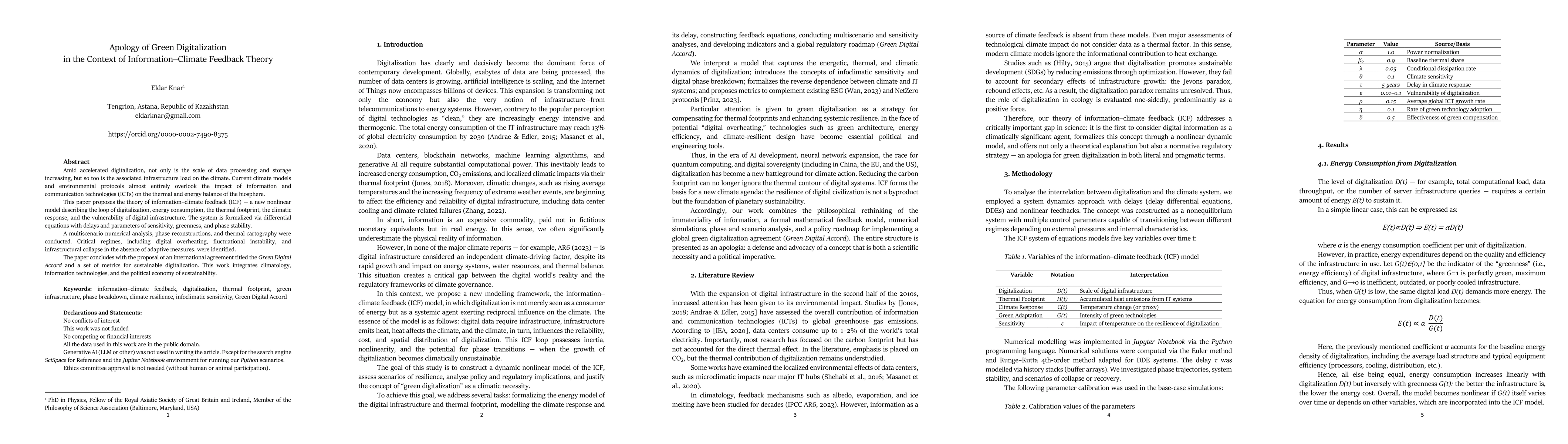 Amid accelerated digitalization, not only is the scale of data processing and storage increasing, but so too is the associated infrastructure load on the climate. Current climate models and environmental protocols almost entirely overlook the impact of information and communication technologies on the thermal and energy balance of the biosphere. This paper proposes the theory of information and climate feedback (ICF) as a new nonlinear model describing the loop of digitalization, energy consumption, the thermal footprint, the climatic response, and the vulnerability of digital infrastructure. The system is formalized via differential equations with delays and parameters of sensitivity, greenness, and phase stability. A multiscenario numerical analysis, phase reconstructions, and thermal cartography were conducted. Critical regimes, including digital overheating, fluctuational instability, and infrastructural collapse in the absence of adaptive measures, were identified. The paper concludes with the proposal of an international agreement titled the Green Digital Accord and a set of metrics for sustainable digitalization. This work integrates climatology, information technologies, and the political economy of sustainability.