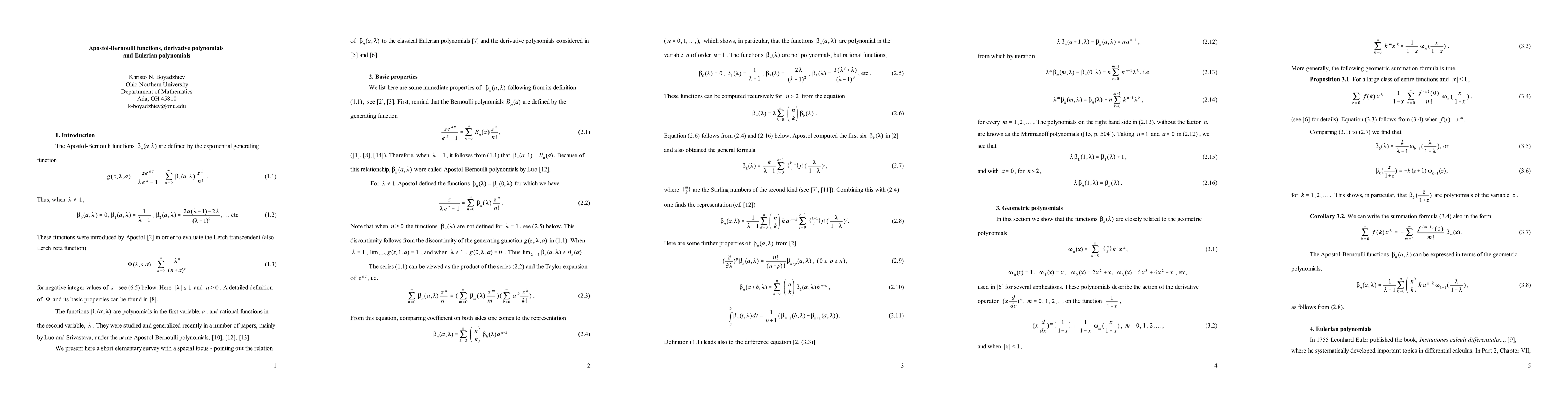 Title: Apostol-Bernoulli functions, derivative polynomials and Eulerian polynomials Summary: This paper surveys Apostol-Bernoulli functions, their connections to Eulerian polynomials and derivative polynomials, and provides integral representations for these mathematical constructs.